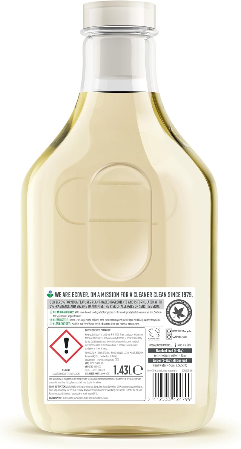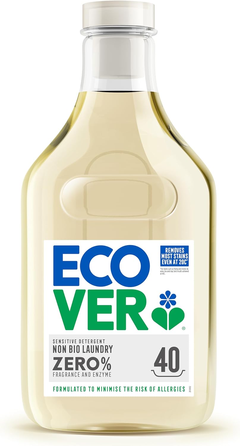 Experience gentle, effective cleaning with Ecover Concentrated Non-Bio Zero Laundry Detergent, specially formulated for sensitive skin. This plant-based, fragrance-free, and enzyme-free formula is allergy-approved and recommended by the British Allergy Foundation, making it ideal for households seeking a hypoallergenic laundry solution.