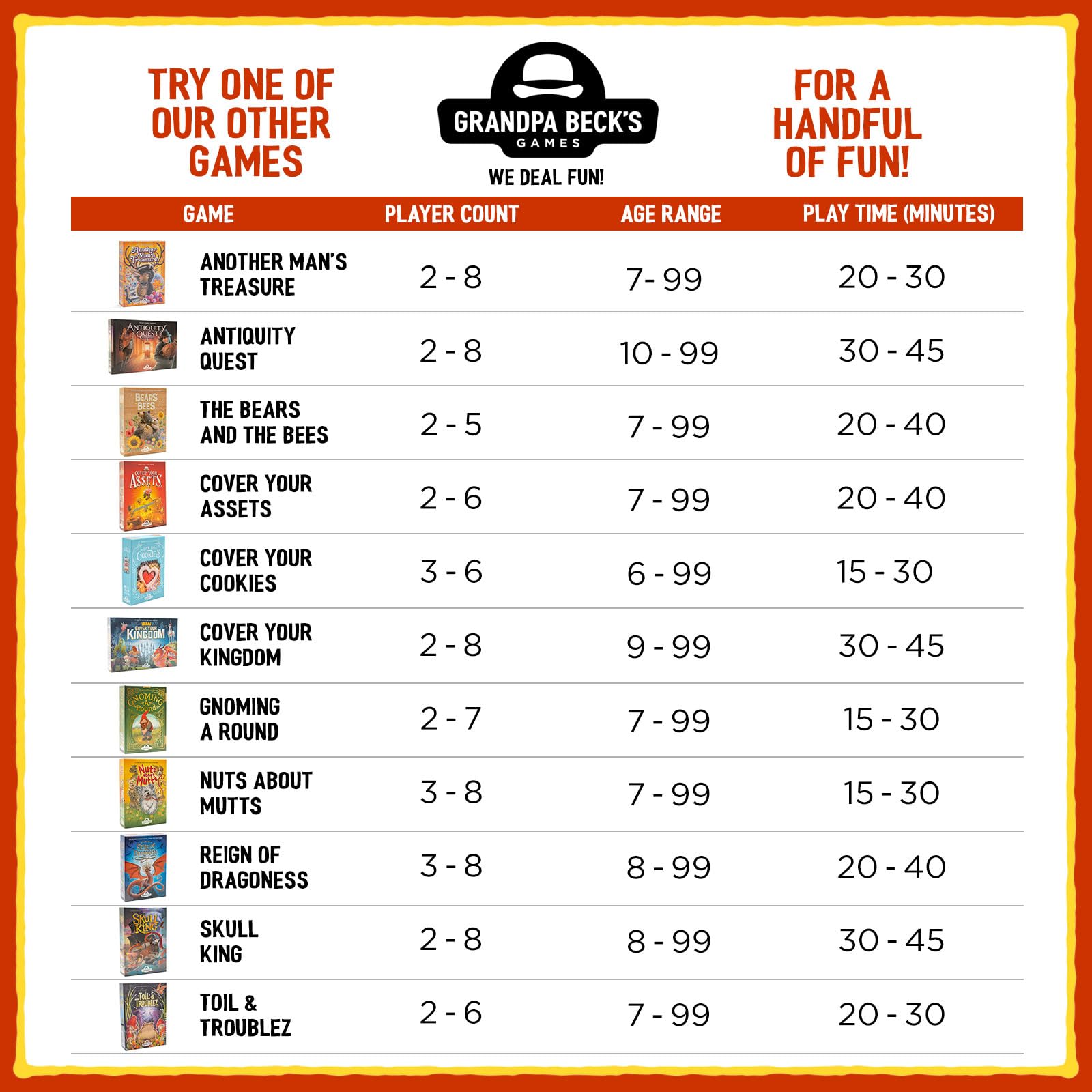 Trusted by millions, Grandpa Beck’s Games has created bestsellers like "Cover Your Assets" and "Skull King". With over two million games sold, their collection brings fun and strategy to family game nights, parties, and gatherings. Experience the joy of competitive set collection with Cover Your Cookies—where no one is safe until the final card!