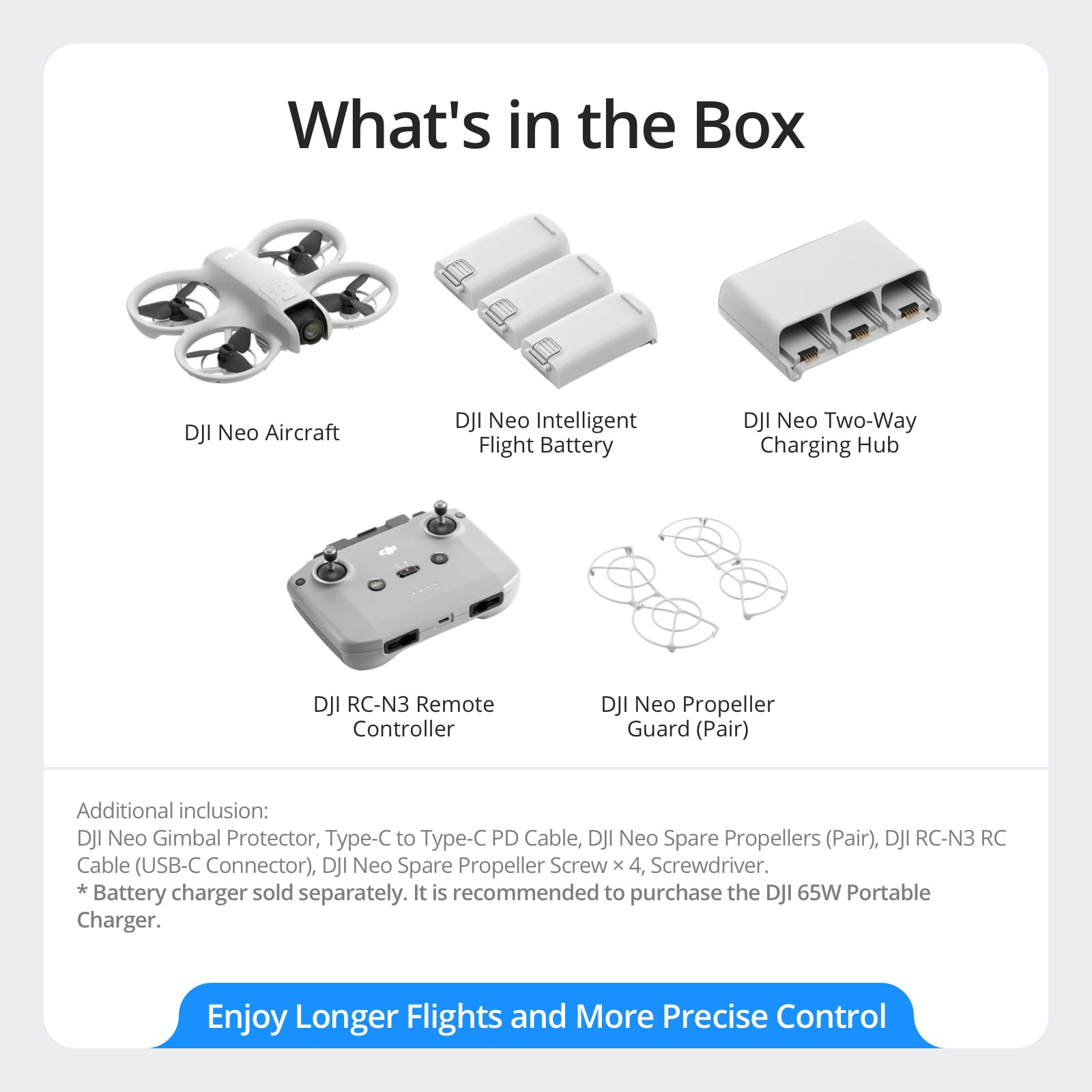 The Fly More Combo includes: DJI Neo drone, RC-N3 remote controller, 3 batteries, Two-Way Charging Hub, and propeller guard pair—everything you need for extended flight sessions. (Battery charger sold separately; DJI 65W Portable Charger recommended.)