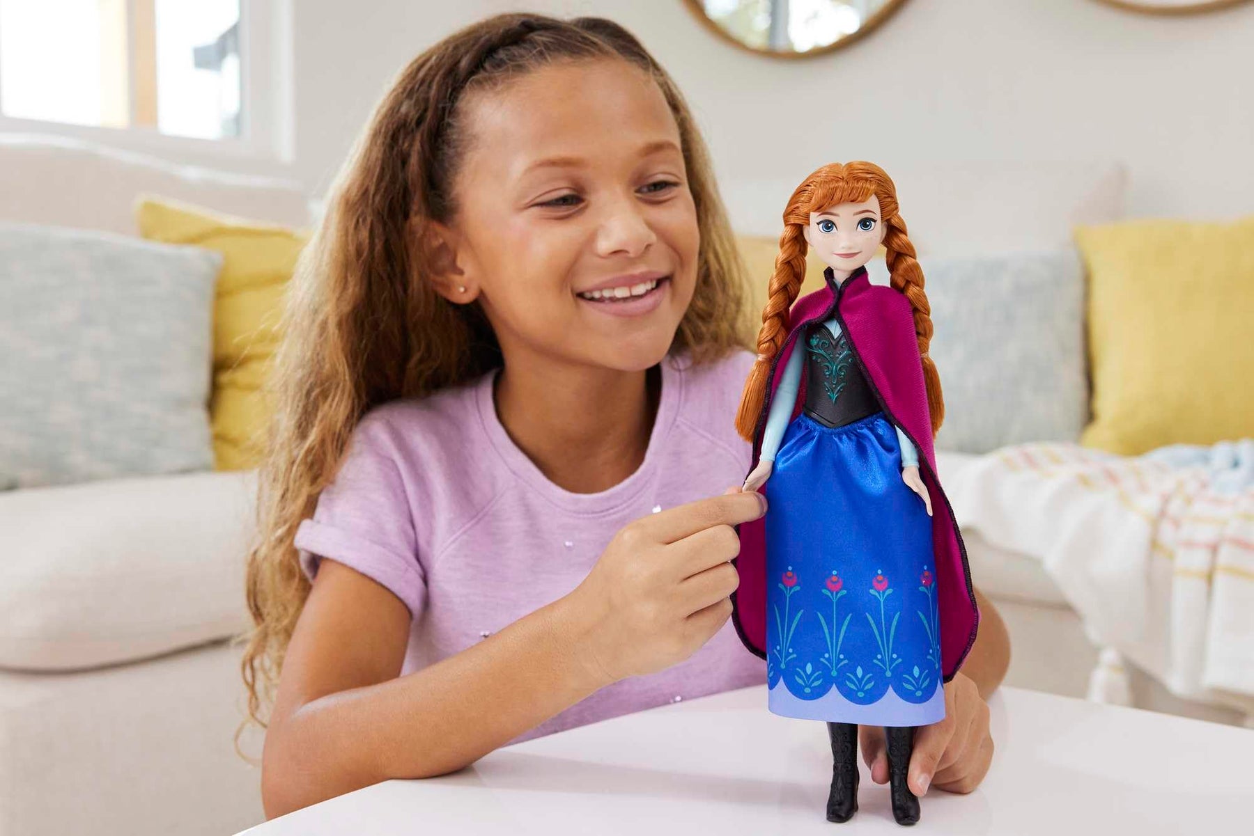 Meet this Anna doll, inspired by the fearless and determined heroine from Disney's Frozen! This posable fashion doll is shown in her signature travel look, with accessories that include shoes and a soft cape and skirt. In her signature outfit from the movie, this Anna doll is ready to journey to save the kingdom! Doll cannot stand alone. Colors and decorations may vary.