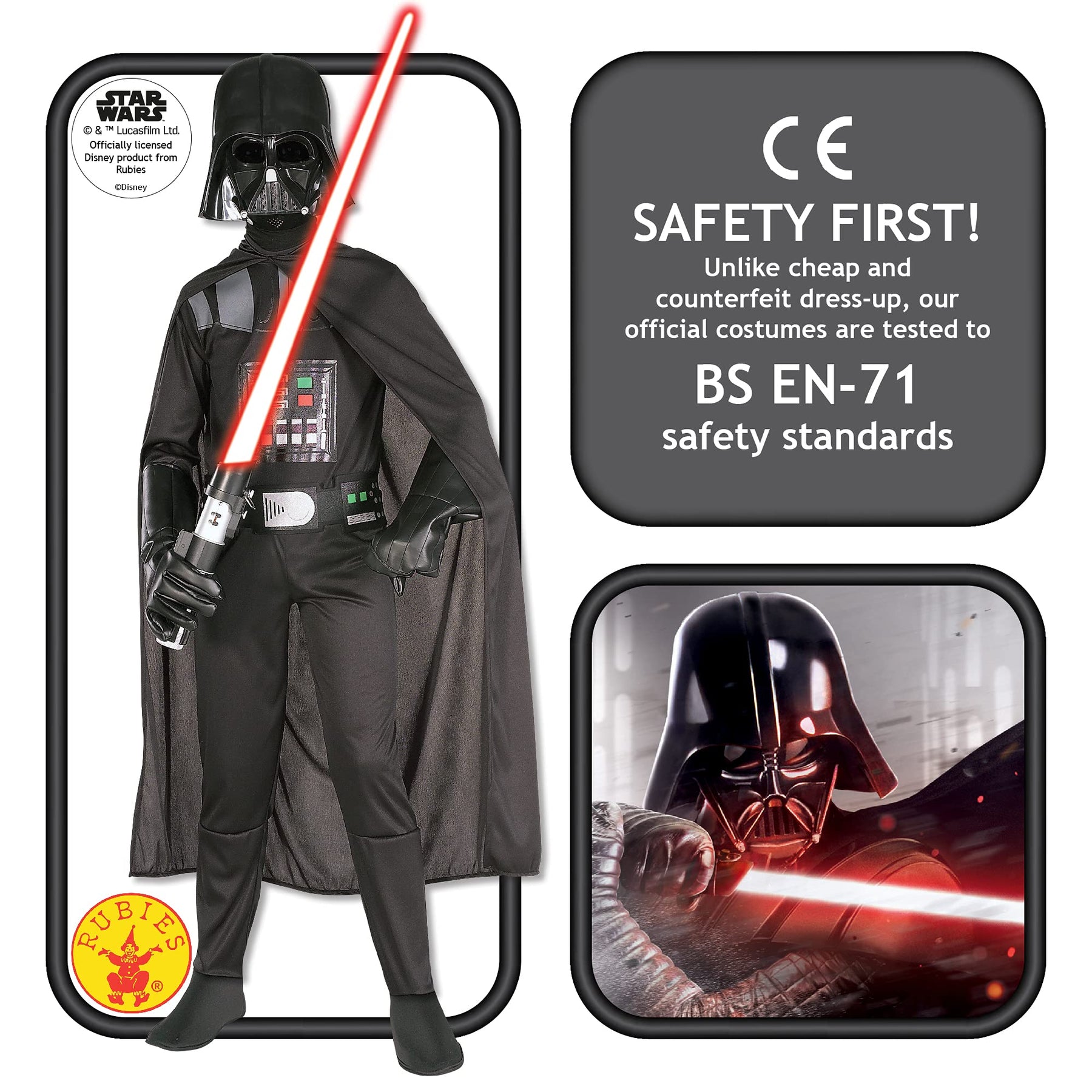 • Includes suit, cape, and mask—everything needed for a complete Darth Vader look