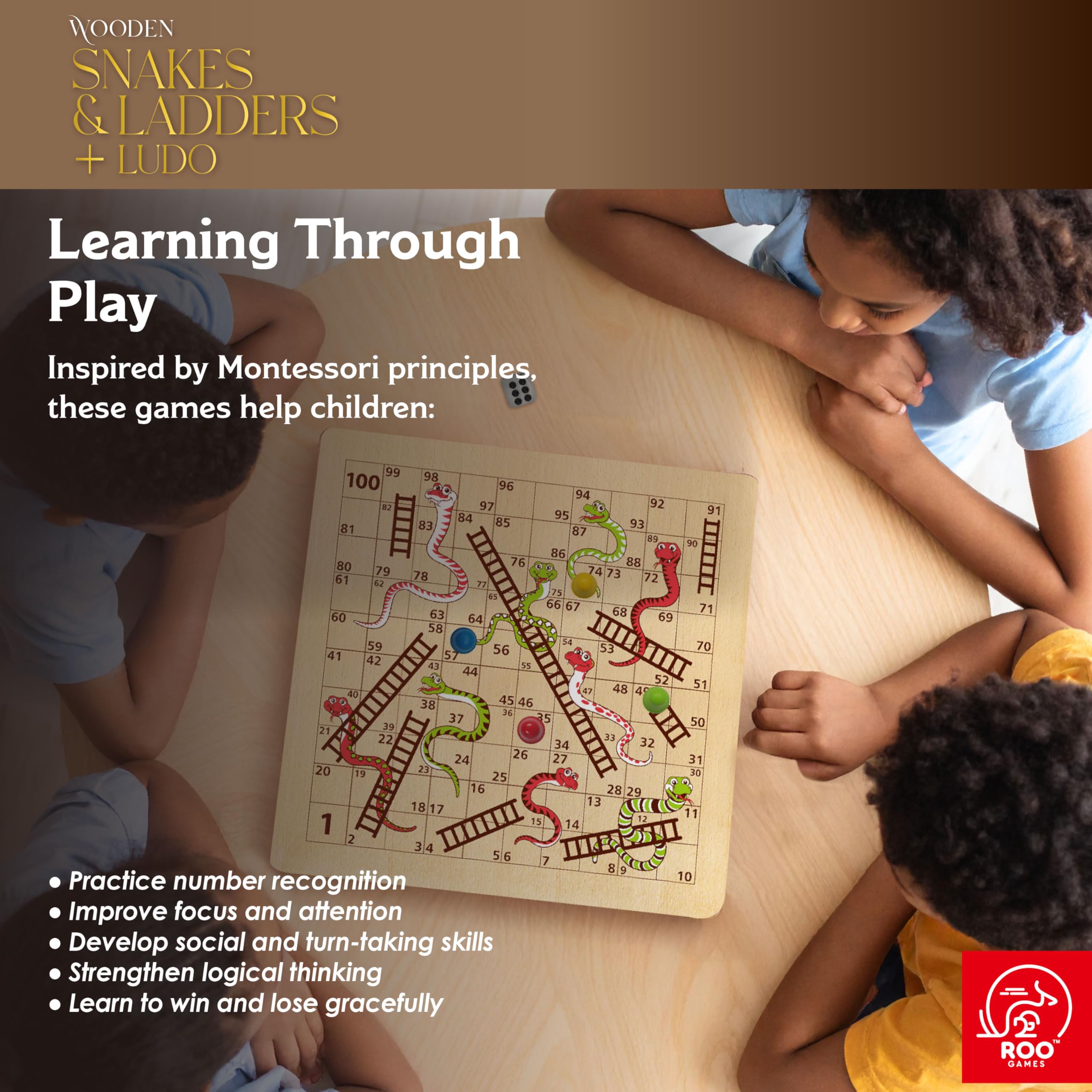 • ROO GAMES Wooden Snakes and Ladders + Ludo Board Game – 2-in-1 Classic Family Game