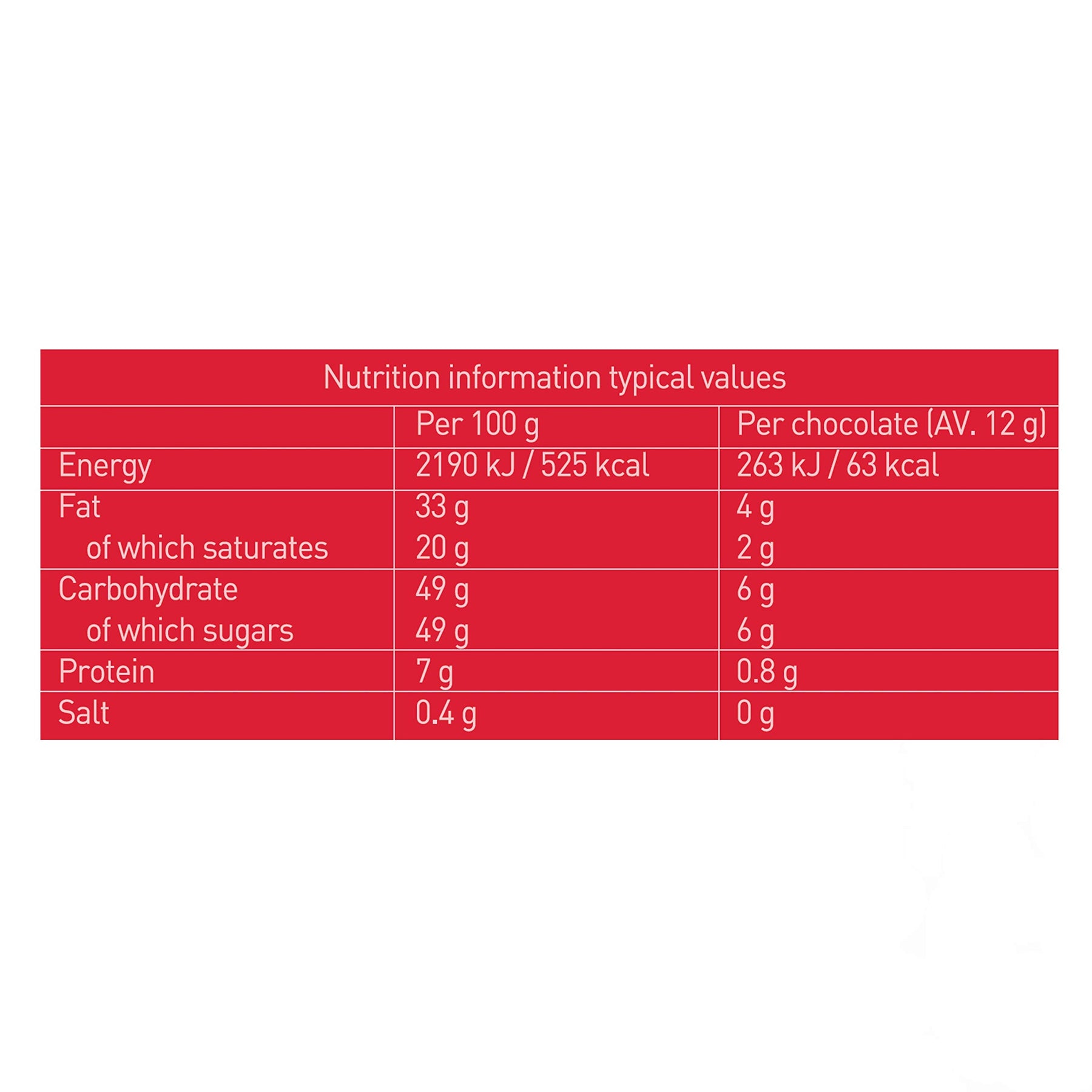 - Crafted with white chocolate containing minimum 28% cocoa butter and 25% milk solids