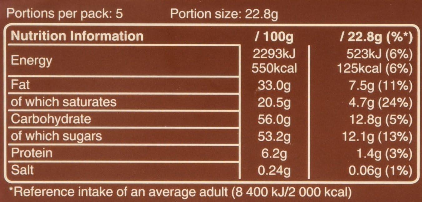 Ingredients: sugar, cocoa butter, skimmed milk powder, cocoa mass, milk fat, whey permeate (milk), palm fat, wheat flour, emulsifier (soya lecithin), cocoa powder, sunflower oil, glucose syrup, colour (E153), salt, raising agent (E503). May contain peanuts, almonds, hazelnuts.