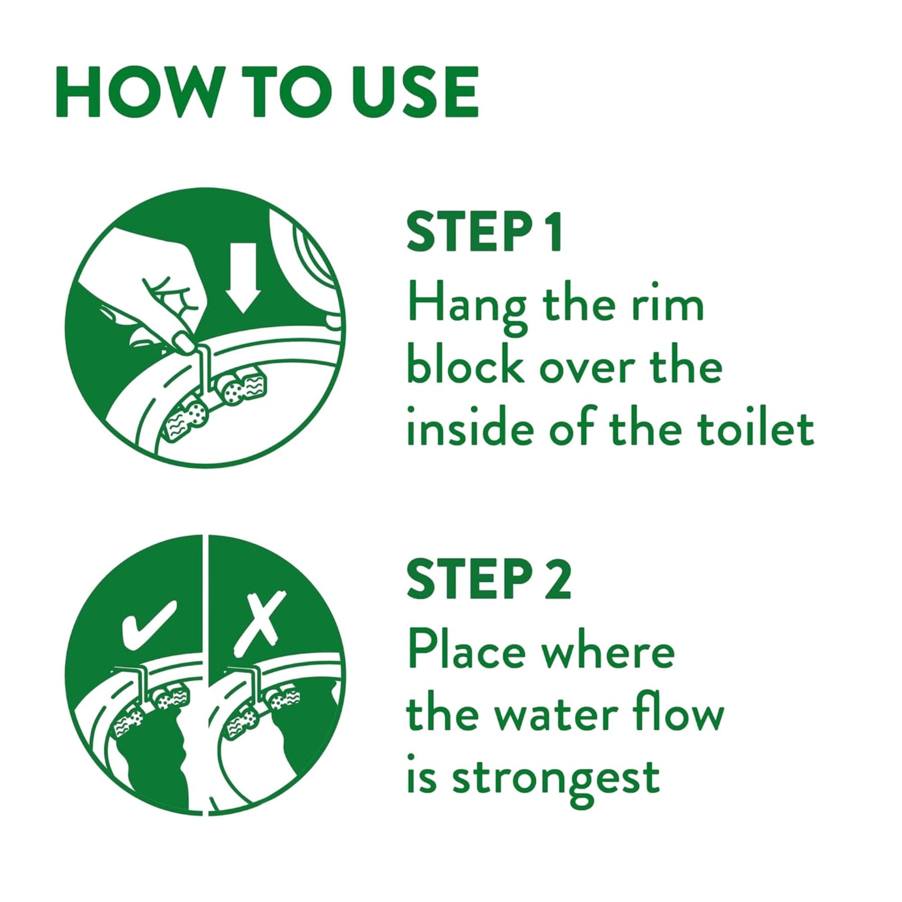 • Directions: Break the plastic lock, hang the block inside the toilet rim, position in strongest water flow, remove when empty