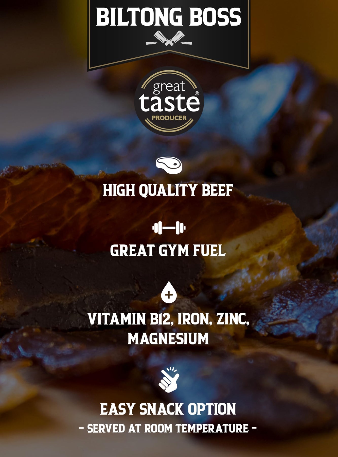 Biltong Boss Chilli Bites (Snap Sticks) are a flavourful, high-protein beef snack made from premium silverside beef with a bold chilli spice blend. These bite-sized treats deliver the authentic taste of traditional South African biltong with a satisfying kick, perfect for those seeking a healthy, on-the-go snack.