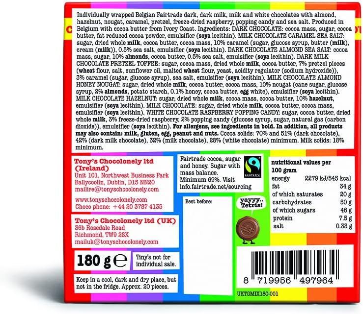 Manufactured by Tony’s Chocolonely Ltd, 36b Rosedale Road, Richmond TW9 2SX. Contact: +447502165852