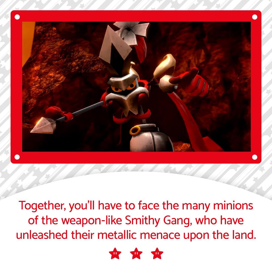 Wishes can come true in Super Mario RPG on Nintendo Switch! Team up with an oddball group of heroes to save Star Road and stop the troublemaking Smithy Gang. This colourful RPG features updated graphics and cinematics that enhance the charm of the unexpected alliance between Mario, Bowser, Peach, and original characters Mallow and Geno. Enter a world filled with eccentric allies and offbeat enemies in an RPG adventure for everyone.