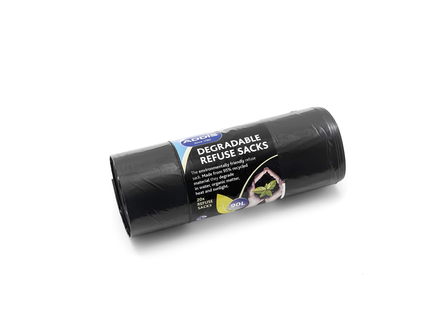 Heavy-duty plastic refuse sacks designed to fit 90-liter bins. Each roll contains 20 black bin bags, ideal for home or office waste management. Made from durable plastic for reliable everyday use.