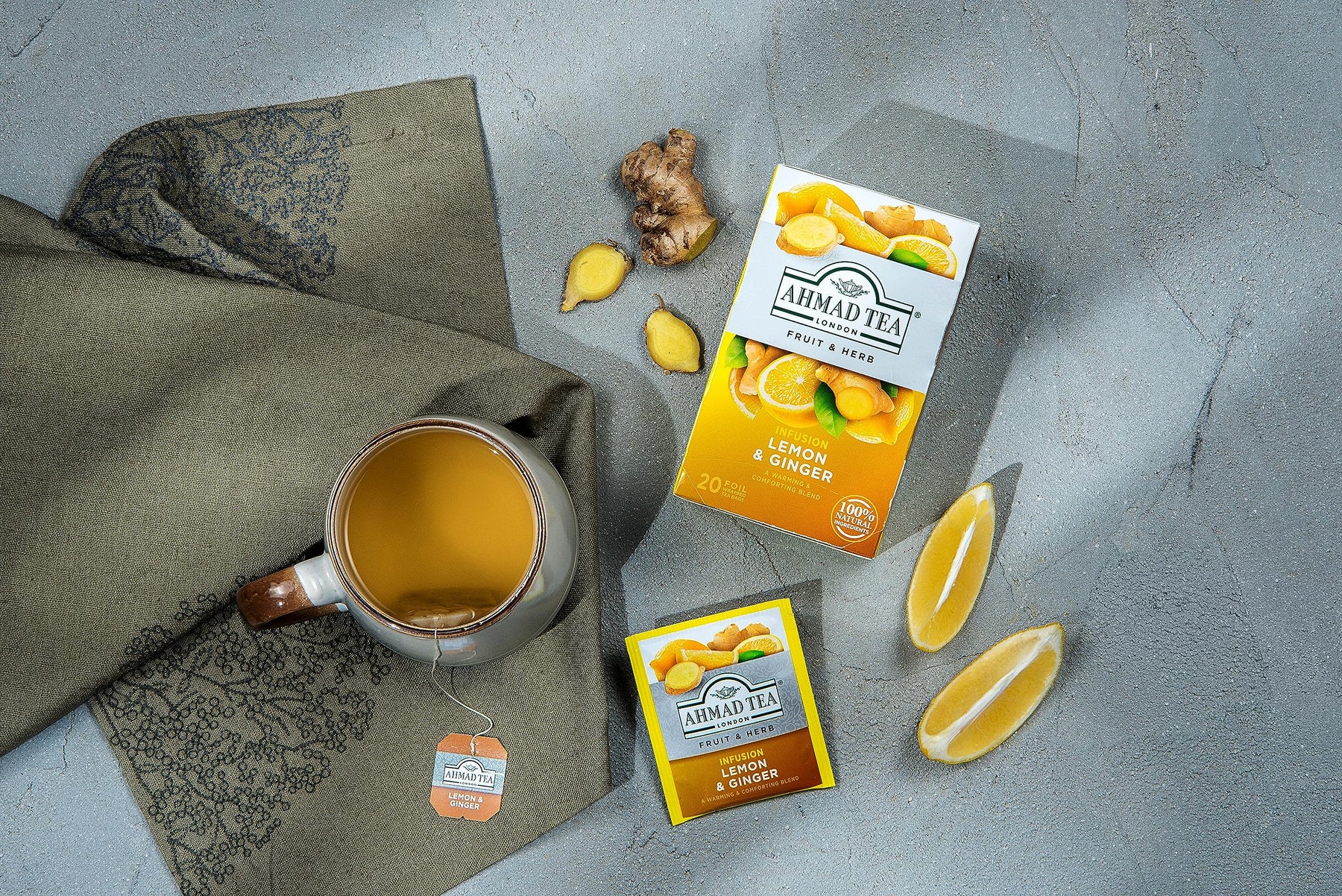 Ahmad Tea's invigorating Lemon & Ginger Infusion offers a perfectly balanced blend of zesty lemon peel, fiery ginger, exotic lemongrass, sweet apple, and hibiscus. This caffeine-free herbal infusion delivers a warming, uplifting experience with bold, aromatic flavors and a straw-gold hue, ideal for awakening the senses any time of day.
