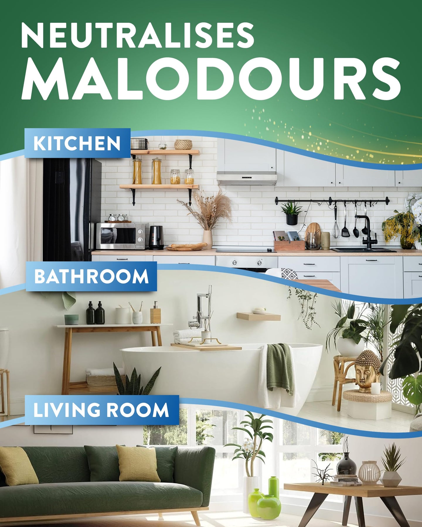 • Eliminates malodors from kitchens, bathrooms, and pet areas