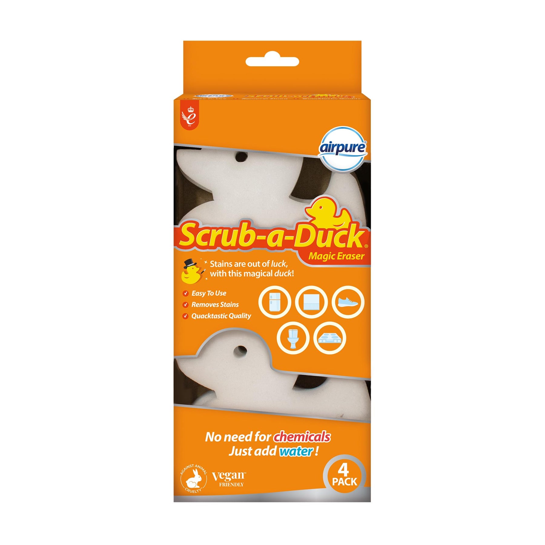 Meet the Scrub-a-Duck Magic Eraser – the quick, chemical-free way to tackle stains all around your home. Just add water to activate the sponge, and this magical duck gets to work erasing marks, smudges, and grime with ease. No sprays, no fuss – simply wet it, rub it, and watch stains vanish before your eyes.