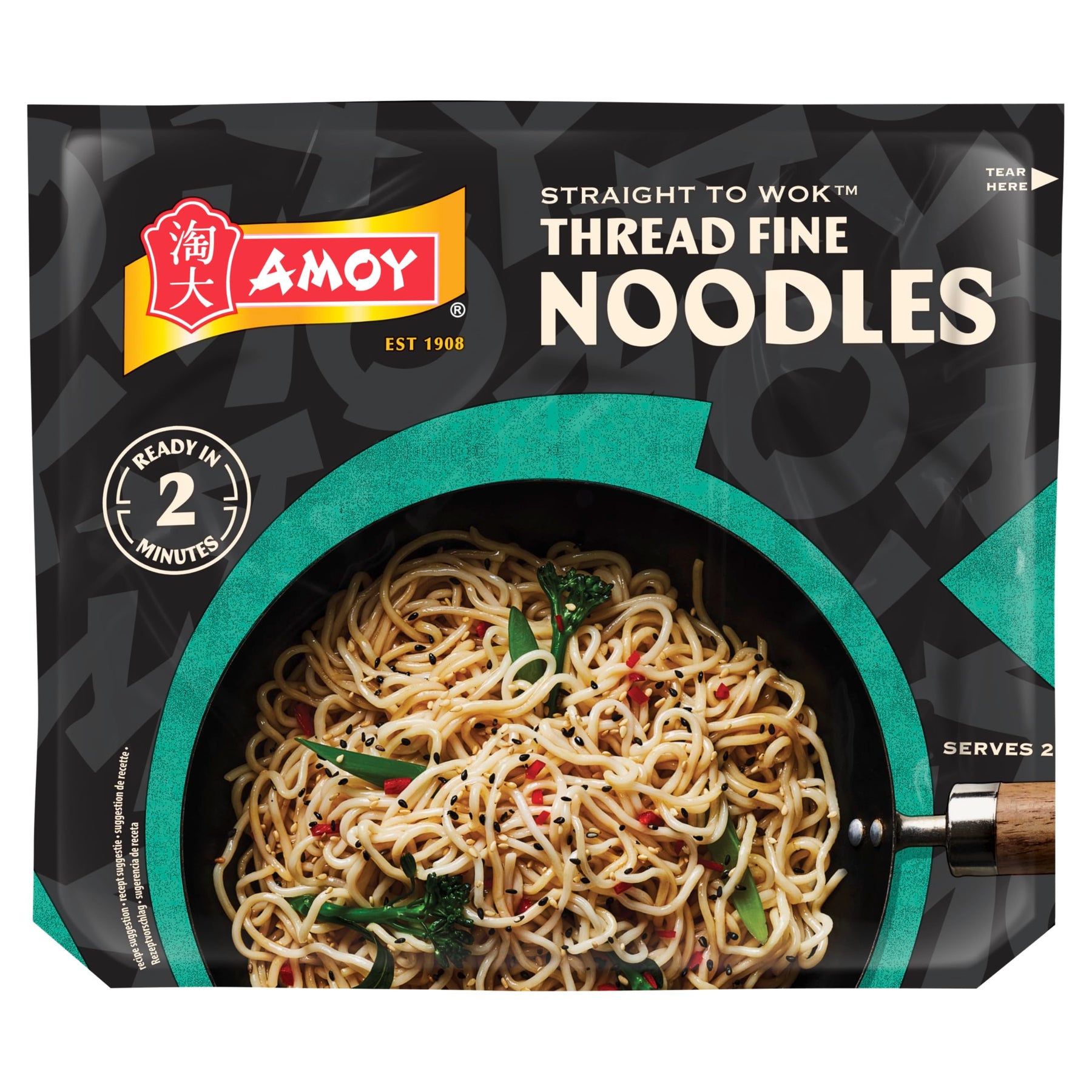 Amoy Straight to Wok Thread Fine Noodles are crafted from natural wheat flour and sealed for freshness, offering a delicate texture that absorbs the rich flavors of your stir-fry in just minutes. With a heritage dating back to 1908, Amoy has perfected the art of Asian cuisine, making it easy to create authentic, great-tasting dishes at home. These quick-cook noodles are ready in just 2 minutes—simply add them straight to your wok after cooking your ingredients and stir-fry for an additional 1–2 minutes until hot. They're also microwave-safe for convenient preparation.