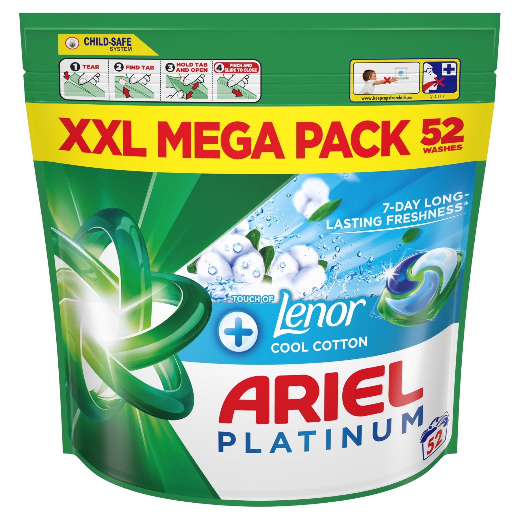 Ariel Platinum PODS® laundry detergent capsules deliver powerful cleaning and long-lasting freshness for your home. Infused with a Touch of Lenor Cool Cotton, these capsules provide 7-day freshness even while stored, keeping your laundry smelling clean and fresh wash after wash. Ideal for busy households, they’re designed to tackle tough stains even in cold water cycles, helping you save energy without sacrificing performance.