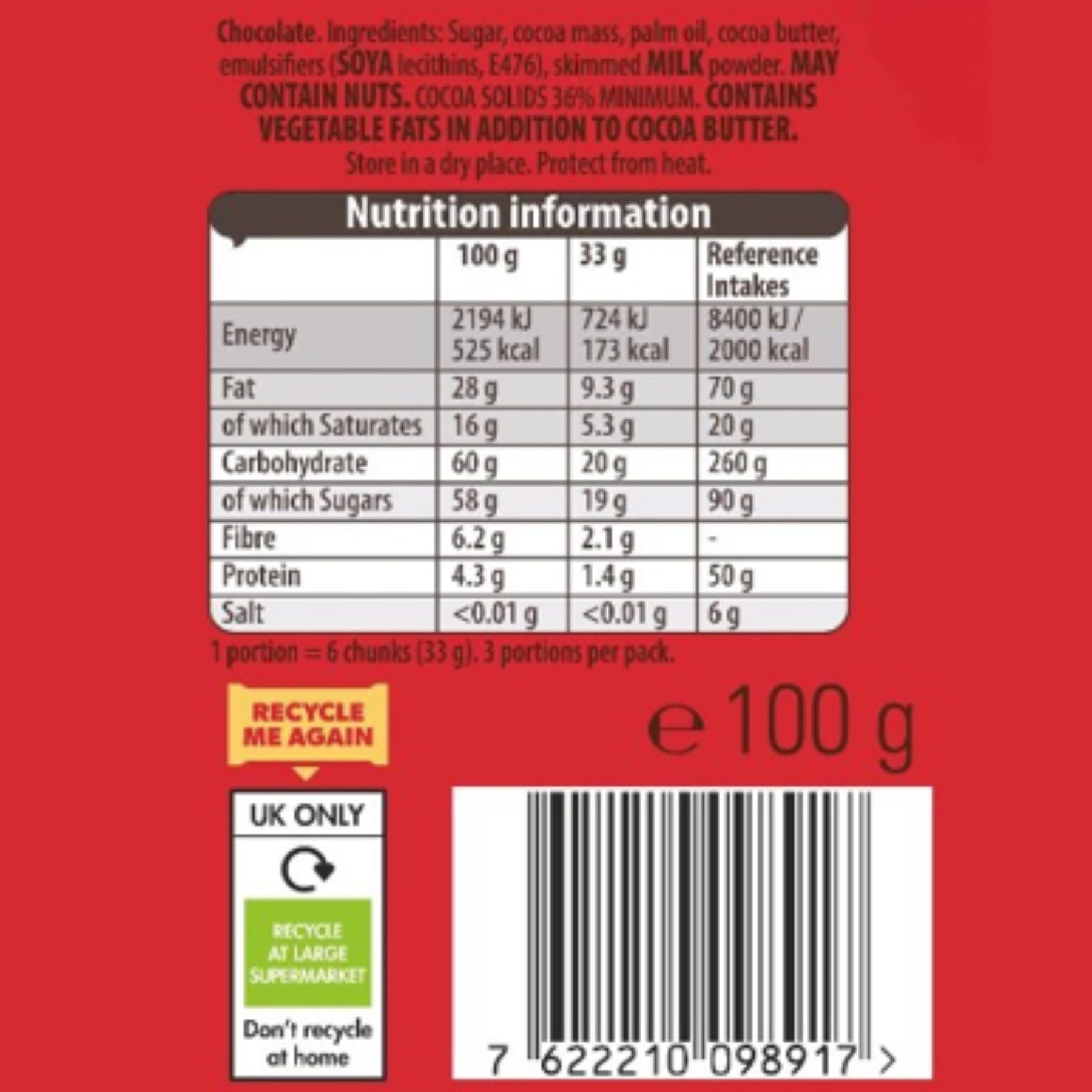 • Ingredients: Sugar, Cocoa Butter, Cocoa Mass, Palm Oil, Emulsifiers (SOYA Lecithin, E476); May contain NUTS