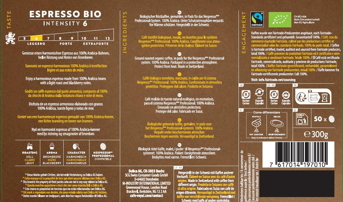 An aromatic organic espresso with notes of cinnamon and aromas of roasted peanuts, Café Royal Espresso Bio is crafted from 100% fine Arabica beans. This Fairtrade-certified coffee delivers a balanced intensity with a strength level of 6/10, ideal for espresso lovers seeking a rich and spicy profile. Each pack contains 50 compatible pods designed specifically for Nespresso® Professional machines, ensuring consistent quality and flavor in every 40 ml cup.