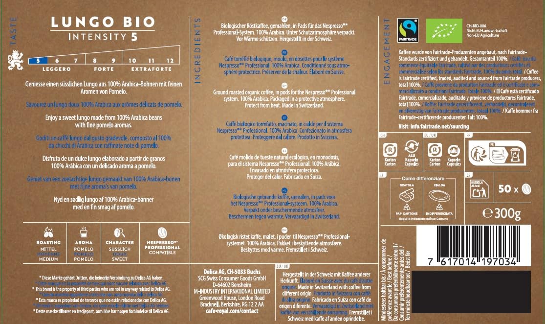 Roasted and packed by Delica AG, Hafenstrasse 120, CH-4127 Birsfelden, Switzerland. This product is compatible with Nespresso® Professional systems but is not affiliated with Delica AG.