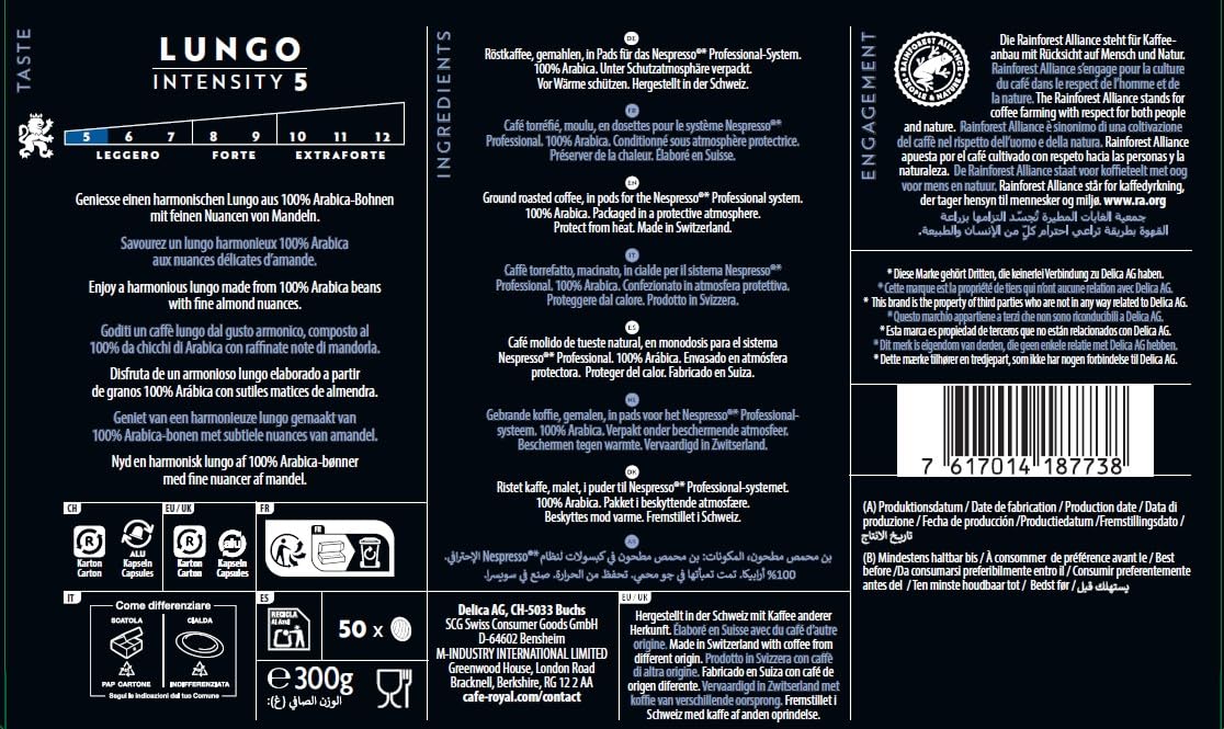 Café Royal Lungo delivers a creamy coffee experience with light nutty-chocolate notes and a delicate caramel aroma. Crafted from 100% fine Arabica beans sourced exclusively from UTZ-certified farms, this Lungo is ideal for those who appreciate a smooth, well-balanced coffee with a strength level of 2/10. Each pack contains 50 compatible coffee pods designed specifically for Nespresso Professional (Business Solutions) machines, ensuring consistent quality and rich flavor in every cup.