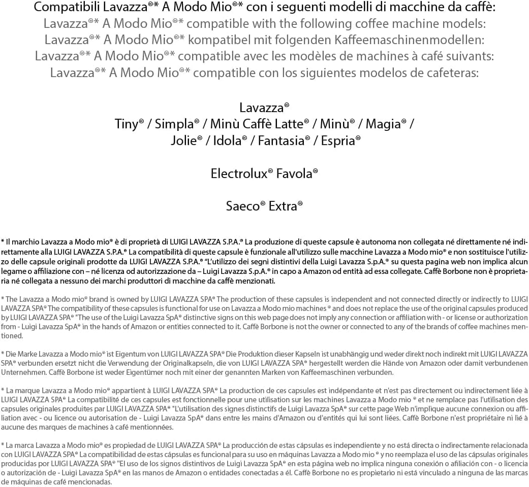 • Compatible with Lavazza A Modo Mio domestic machines: Espressgo, Espria, Extra, Fantasia, Favola Electrolux, Idola, Jolie, Magia, Minù, Minù Caffè Latte, Simpla, Tiny
