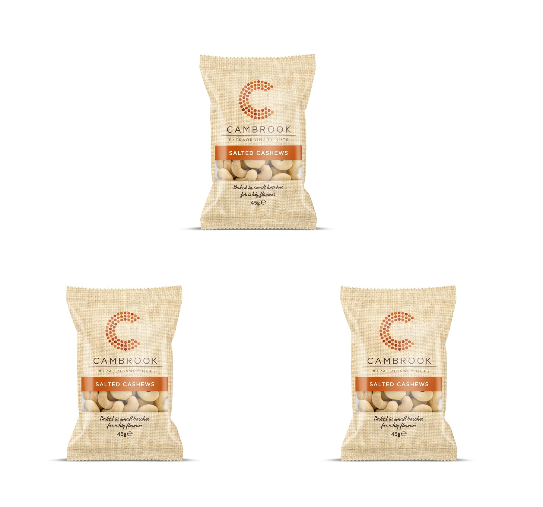 Baked & Salted Cashews in a 45g pack, made by Cambrook Extraordinary Nuts. These premium cashews are baked, not fried, using circulated hot air to enhance their natural flavor and deliver a satisfying crunch. Lightly seasoned with sea salt for a savory taste.
