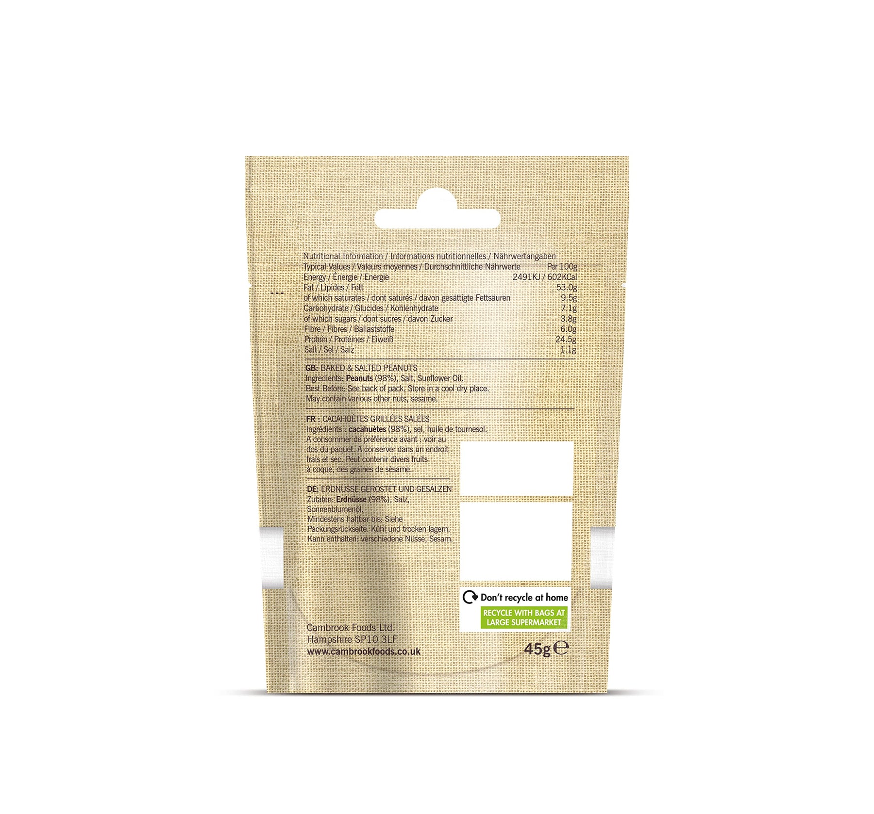 Baked & Salted Peanuts, 45g. These premium peanuts are baked (not fried) using circulating hot air to bring out their full, flavoursome crunch, then lightly seasoned with sea salt for a deliciously satisfying snack.