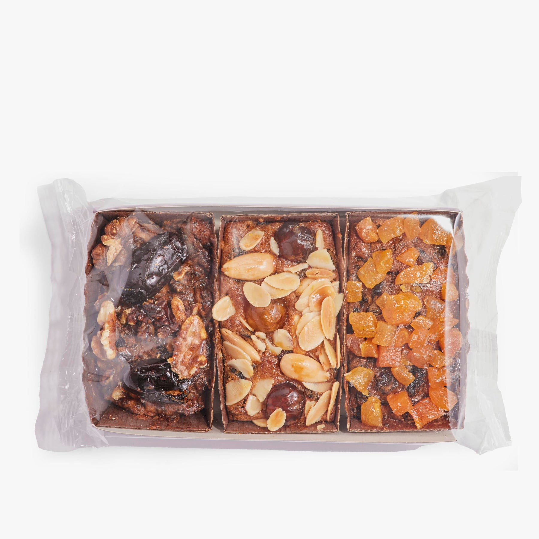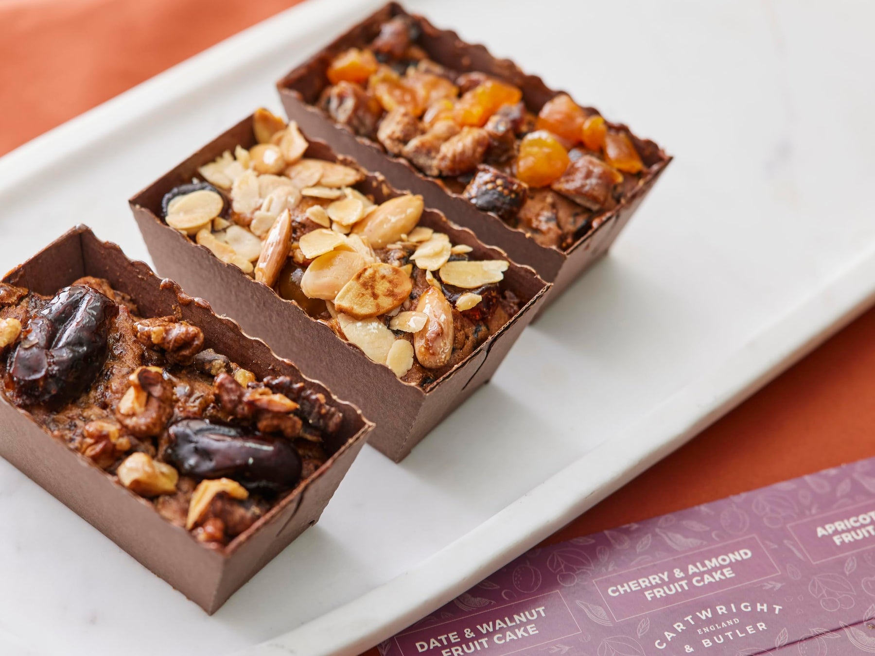 - Three signature mini loaf cakes: Cherry & Almond, Date & Walnut, and Fig & Apricot