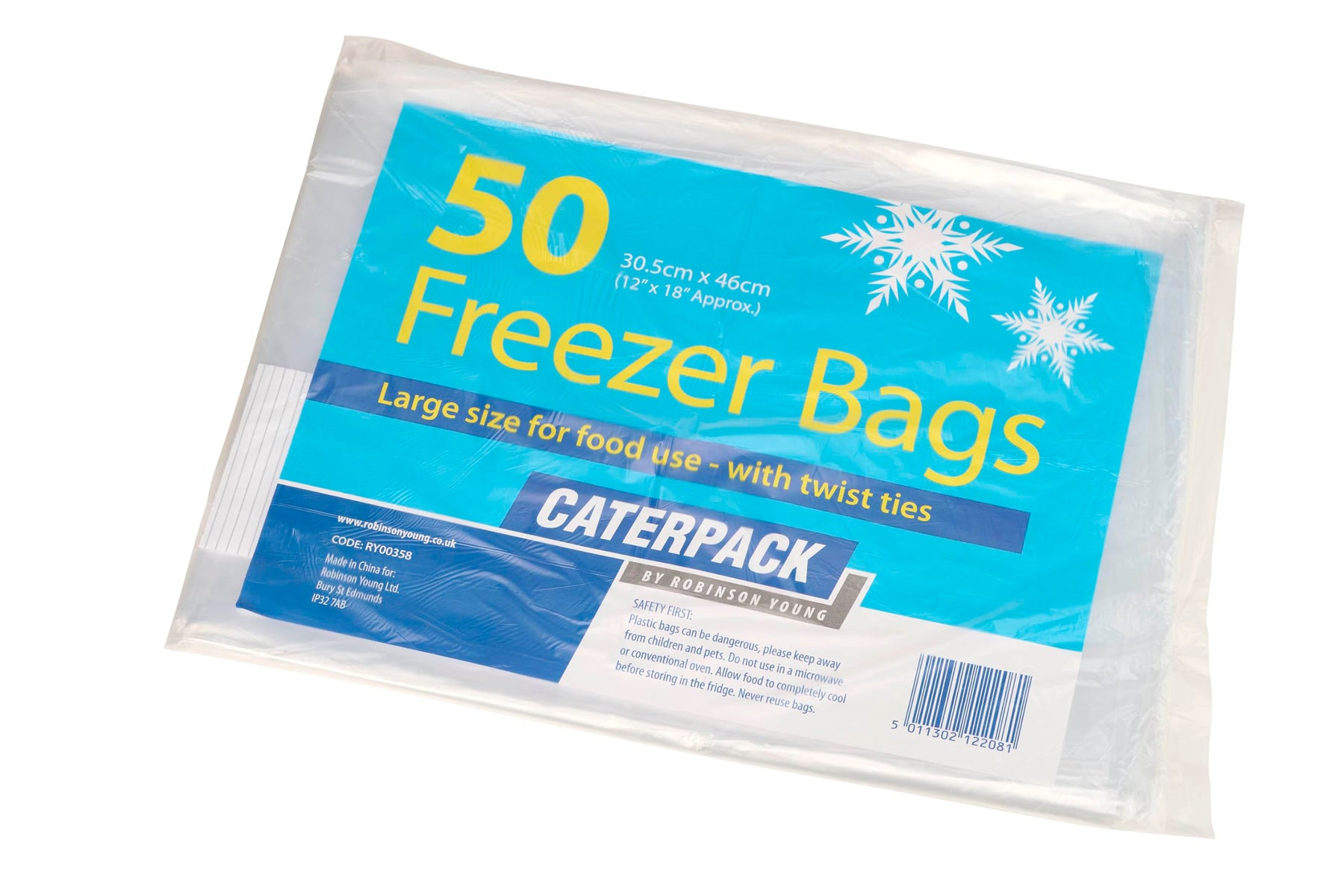 Package includes 50 freezer bags and twist ties. Ideal for home use, meal prep, and bulk food storage.