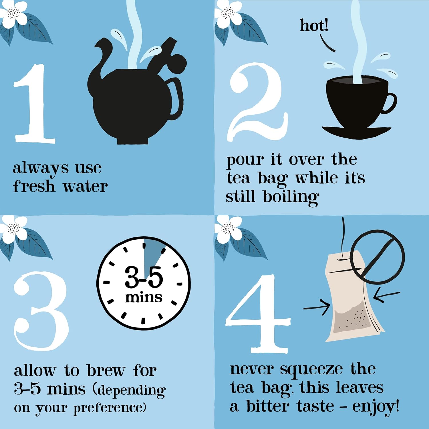 • Directions: Pour boiling water over tea bag and steep for 3–5 minutes