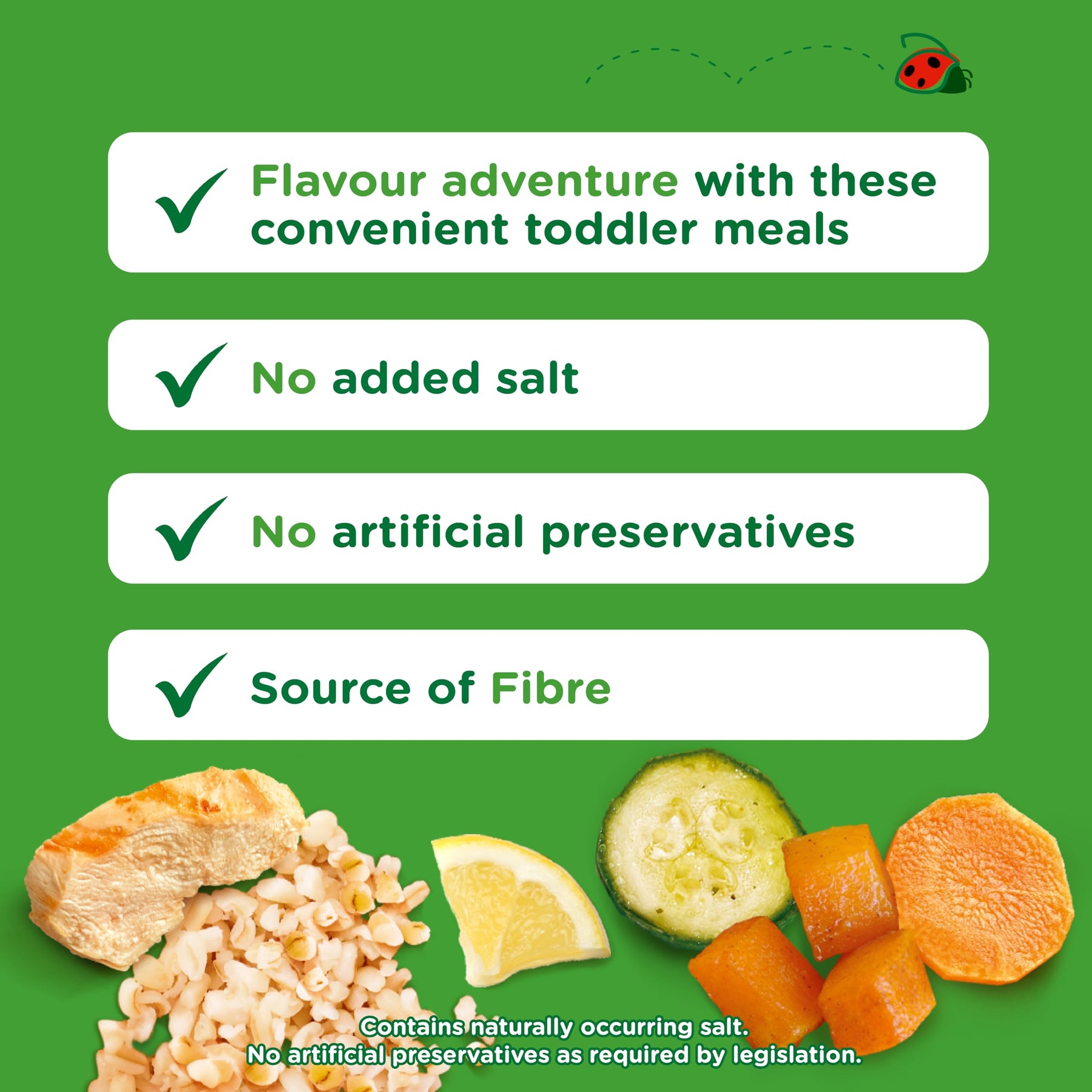 This meal contains no added salt* and no artificial colours, flavours, or preservatives. It is a source of fibre and is suitable for use as part of a varied weaning diet. Simply open the package and serve—no preparation required.
