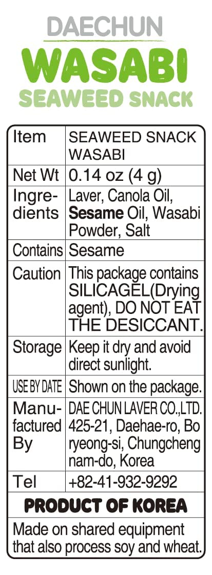 GREAT FOR SNACKING: These 20 individual packs of Daechun Wasabi Seaweed Snacks are perfect for on-the-go enjoyment. Light and easy to carry, the individual packaging ensures maximum freshness by protecting the seaweed from humidity, keeping it crispy and savory. The bold wasabi flavor delivers an exotic taste experience with every bite.