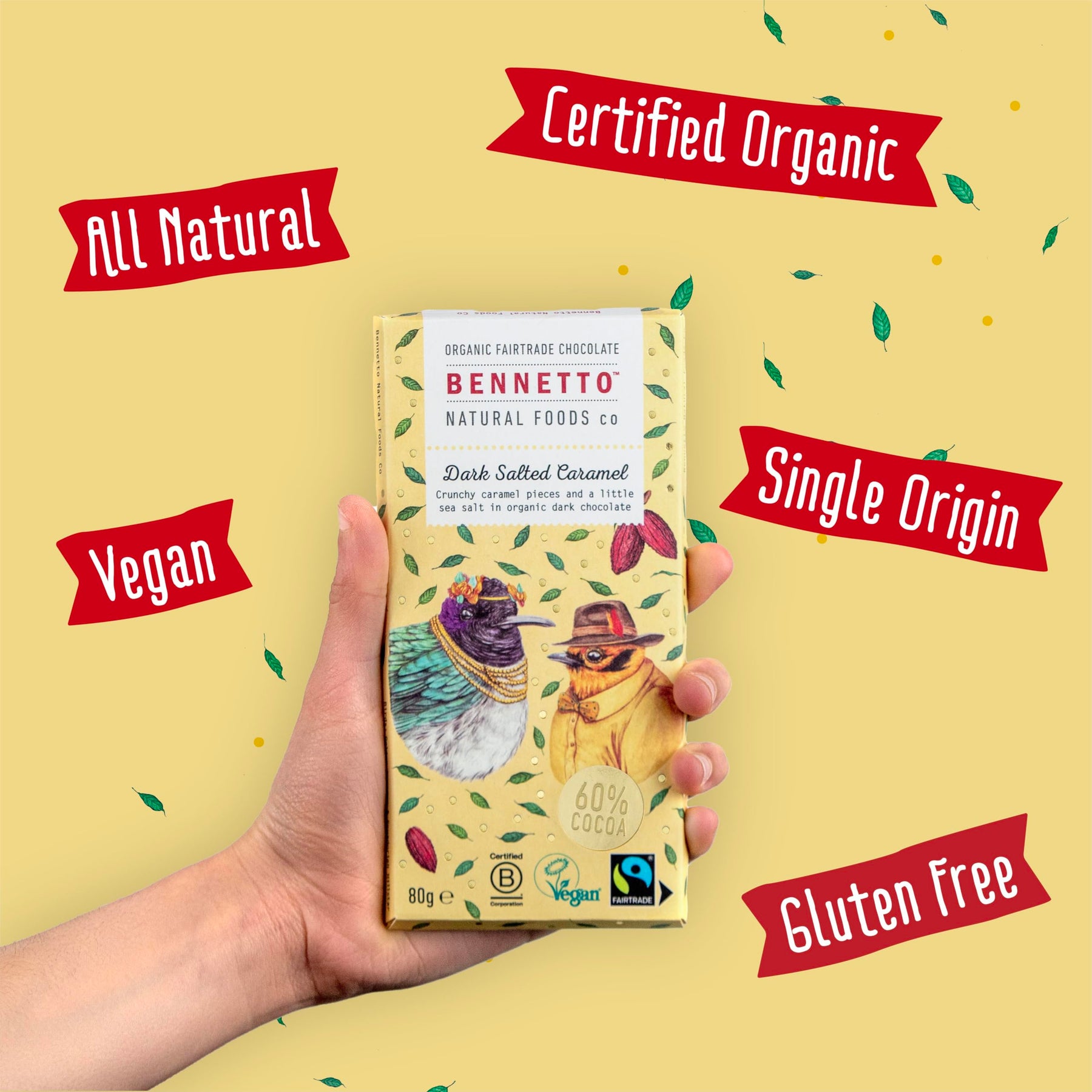 Indulge in the rich, balanced flavours of Bennetto's Dark Salted Caramel chocolate bar, a luxurious blend of smooth 60% dark chocolate, crunchy caramel, and a hint of sea salt. Crafted with single-origin cocoa from Ecuador, this bar delivers a premium taste experience rooted in ethical and sustainable practices.