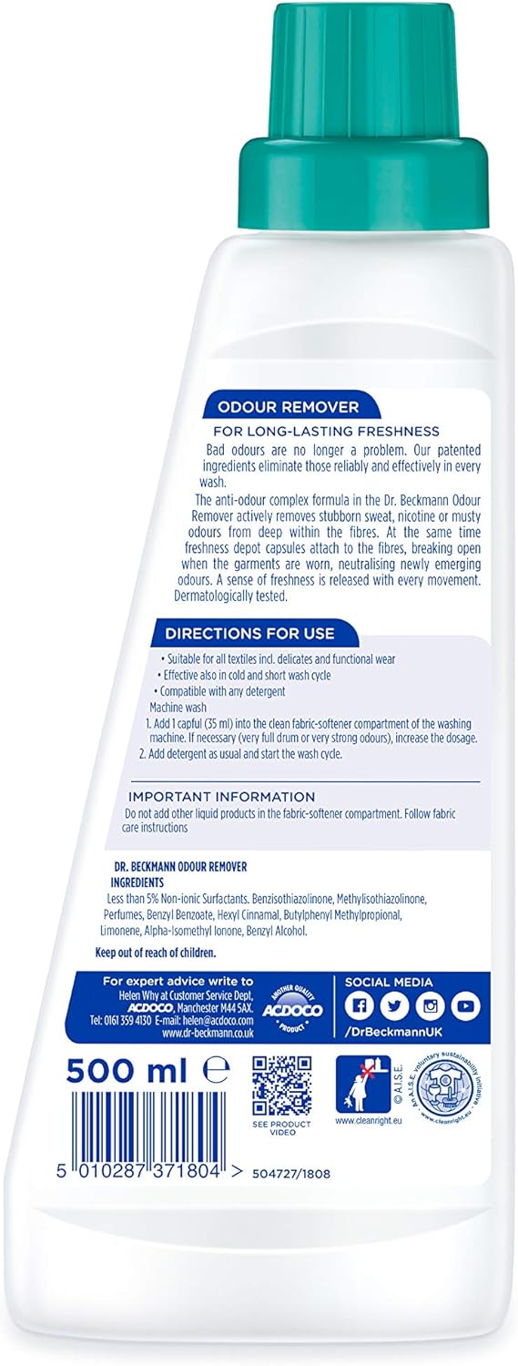Dr. Beckmann Odour Remover effectively eliminates stubborn, ingrained odours from laundry, ensuring clothes stay fresh longer. Ideal for sportswear, towels, and delicates, this formula works deep within fibres to remove sweat, nicotine, food, and musty smells that regular detergents often miss.
