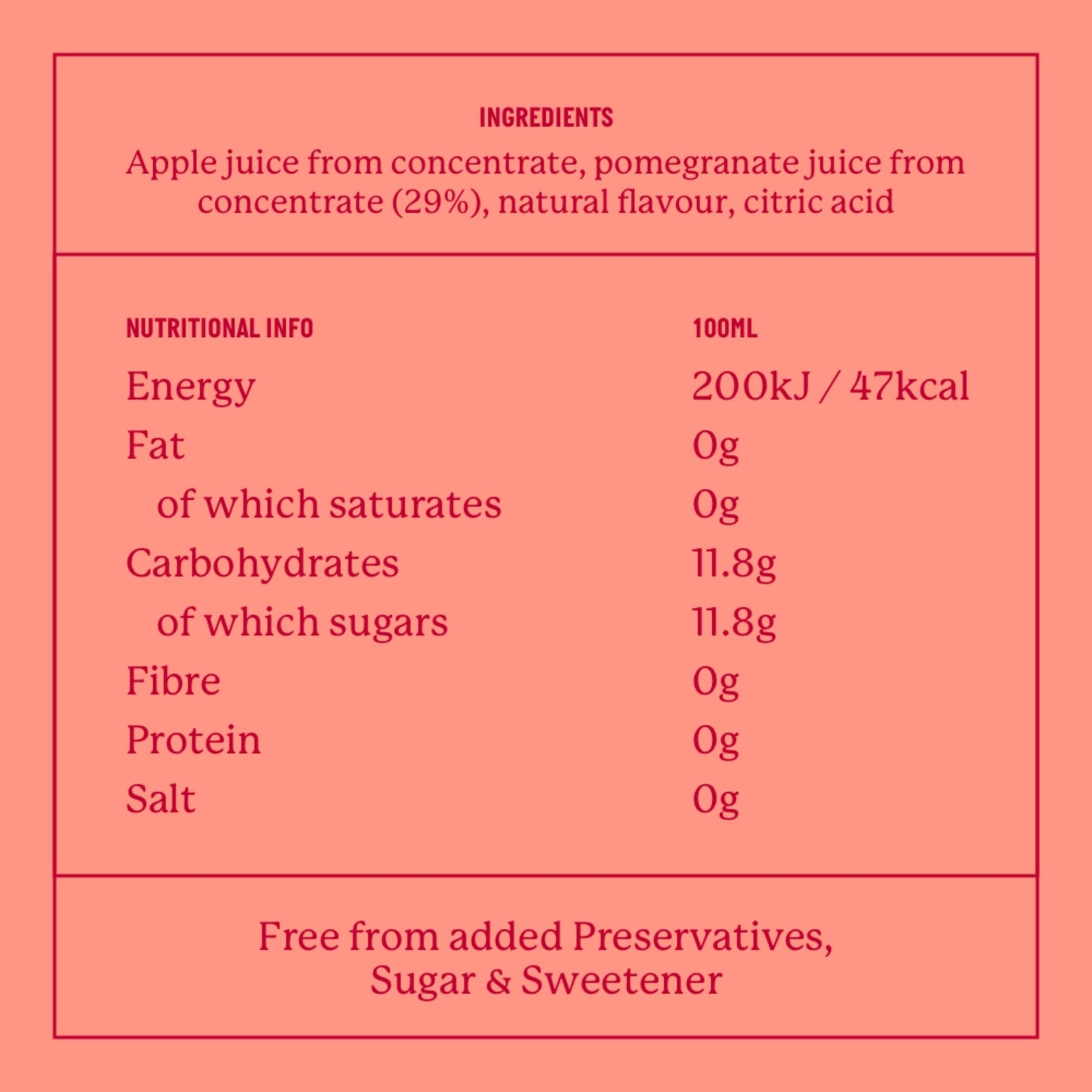 Ingredients: Apple Juice from Concentrate, Pomegranate Juice from Concentrate (29%), Natural Flavor, Citric Acid. Packaged by Eager Drinks, c/o Side Ley, Kegworth, Derby DE74 2FJ.