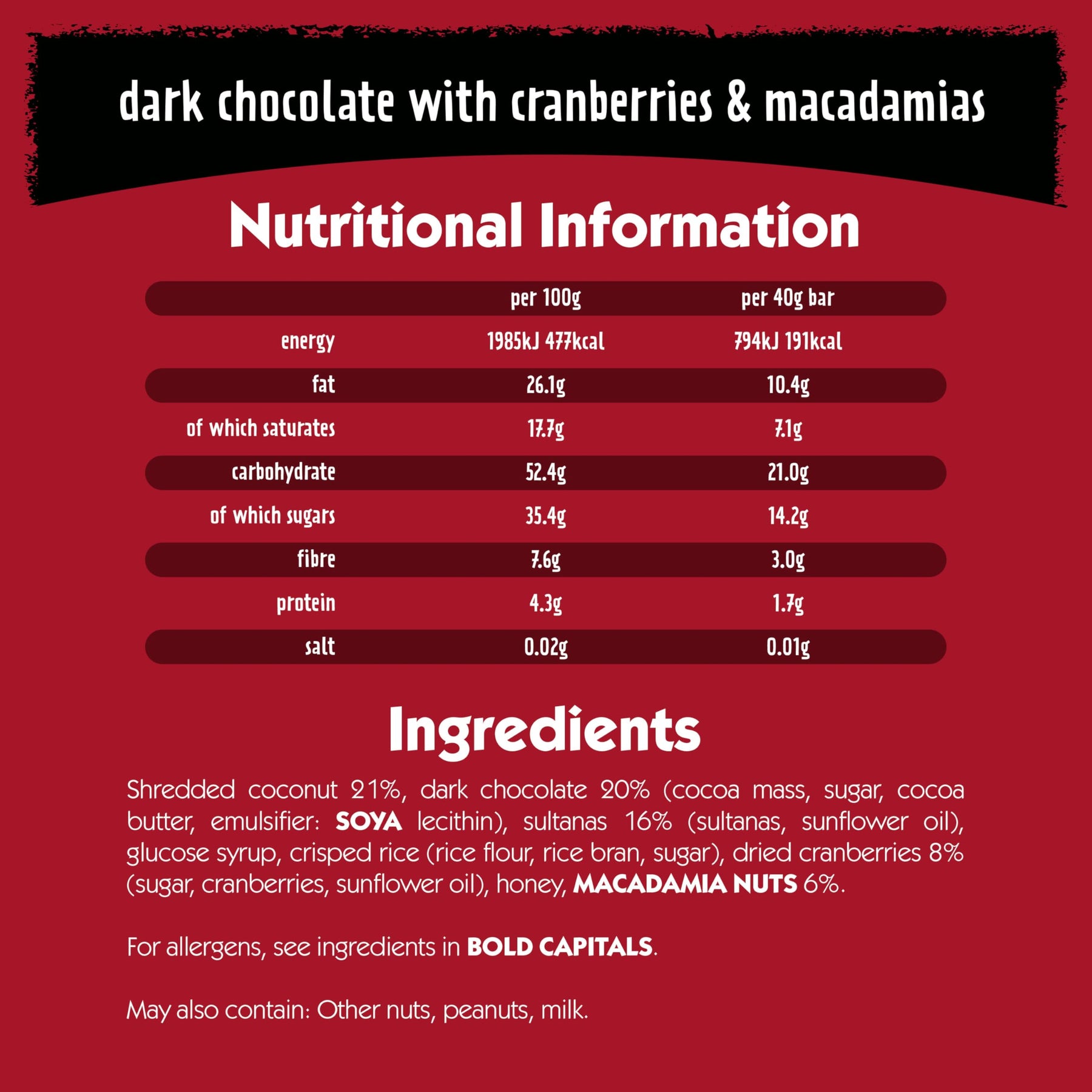 • Ingredients: Shredded coconut 21%, dark chocolate 20% (cocoa mass, sugar, cocoa butter, emulsifier: SOYA lecithin), sultanas 16%, glucose syrup, crisped rice, dried cranberries 8%, honey, macadamia nuts 6%