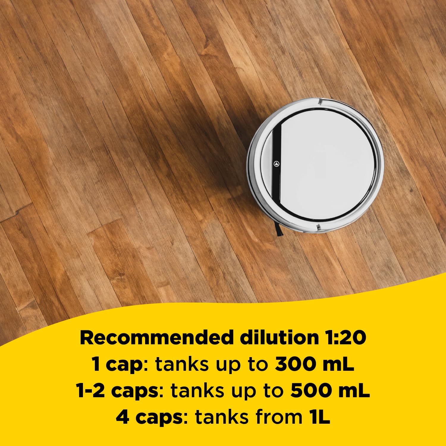 - Add one or more caps of ROBOSHINE to your robot cleaner's water tank based on capacity