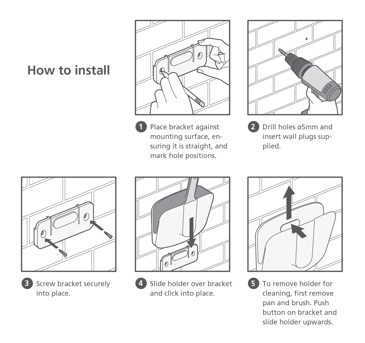- Wall-mounted holder covers brush and pan for cleaner storage