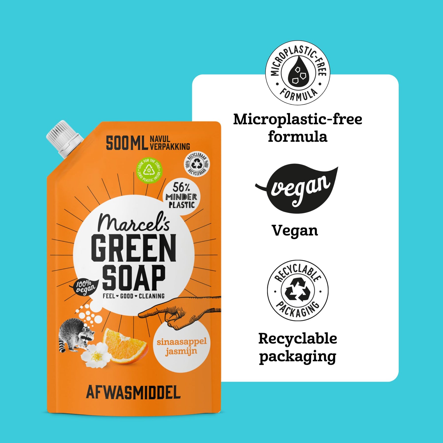 - Designed to refill Marcel's Green Soap Orange & Jasmine dishwashing liquid bottles
