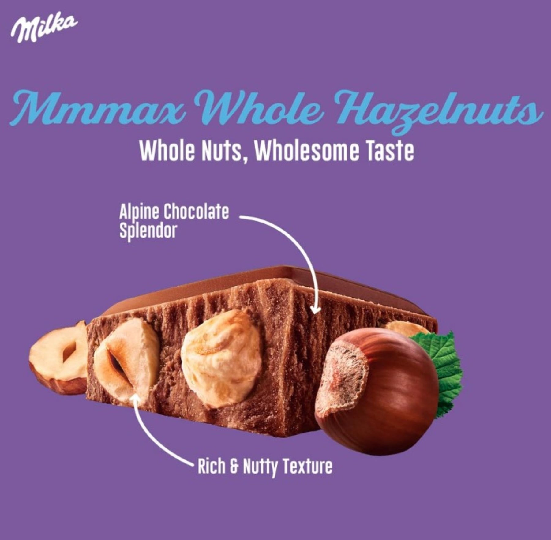 Luxurious Milka Alpine milk chocolate combined with whole, crunchy hazelnuts. This large 250 g bar delivers a balance of silky smooth chocolate and nutty texture, perfect for indulgent chocolate lovers. With 17% hazelnuts, cocoa solids at 30% minimum, and milk solids at 18% minimum, it's crafted for a rich, creamy taste experience.