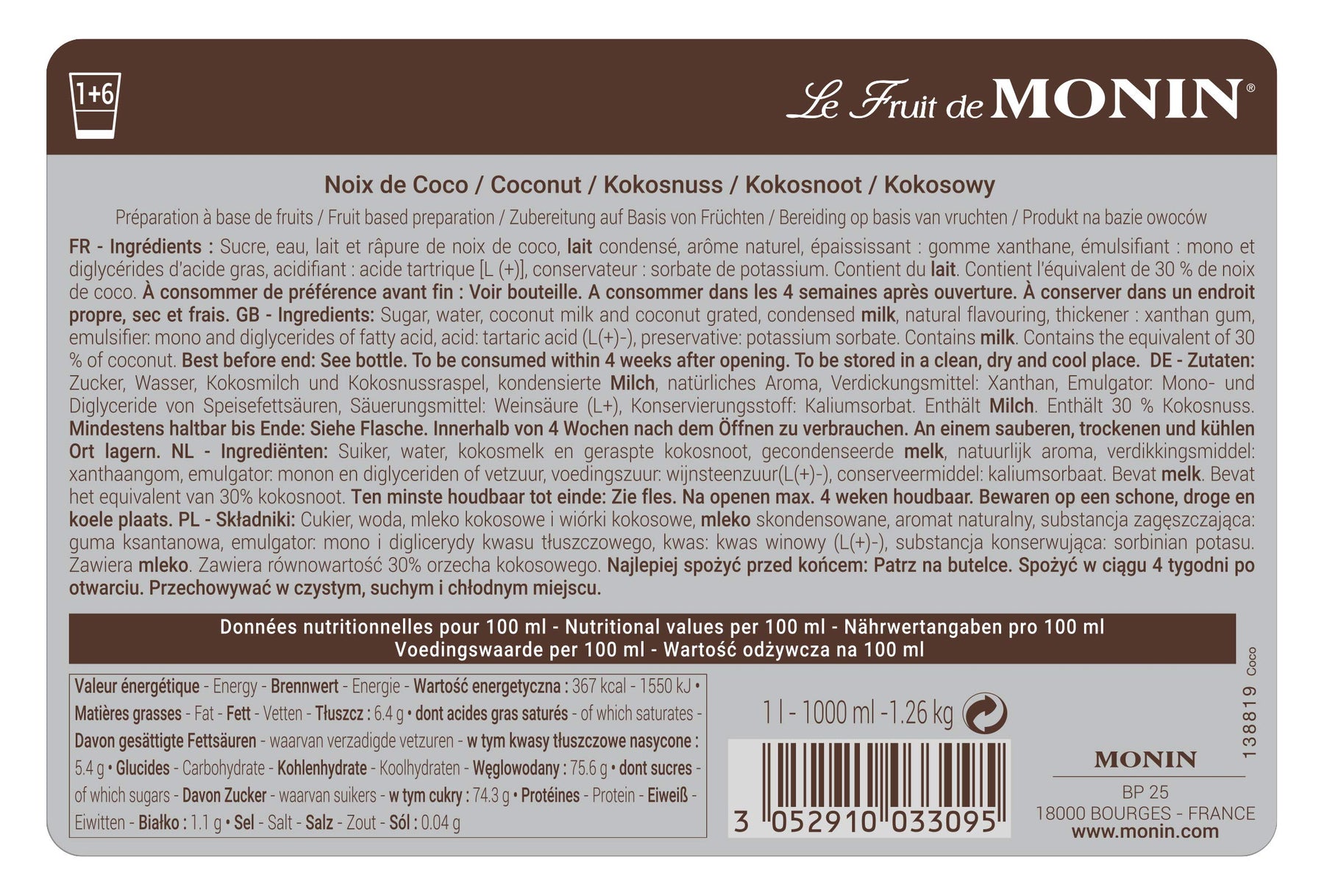 Le Fruit de MONIN Coconut Puree delivers the rich, creamy, and indulgent taste of tropical coconuts, perfect for crafting premium beverages with a luxurious twist. Made with 30% coconut content, including coconut milk and grated coconut, this puree offers an intense candied coconut flavor on the palate with aromatic notes of creamed and desiccated coconut. Ideal for adding depth to dessert drinks, milkshakes, cocktails, mocktails, and iced coffees.