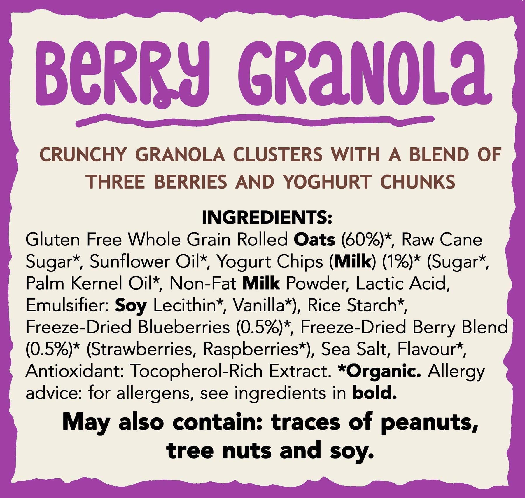 Enjoy the delicious blend of organic, gluten-free granola packed with crunchy clusters, real freeze-dried strawberries, raspberries, blueberries, and yogurt chunks. Perfect for a nutritious breakfast with yogurt or as a satisfying on-the-go snack, this resealable pouch keeps freshness locked in.