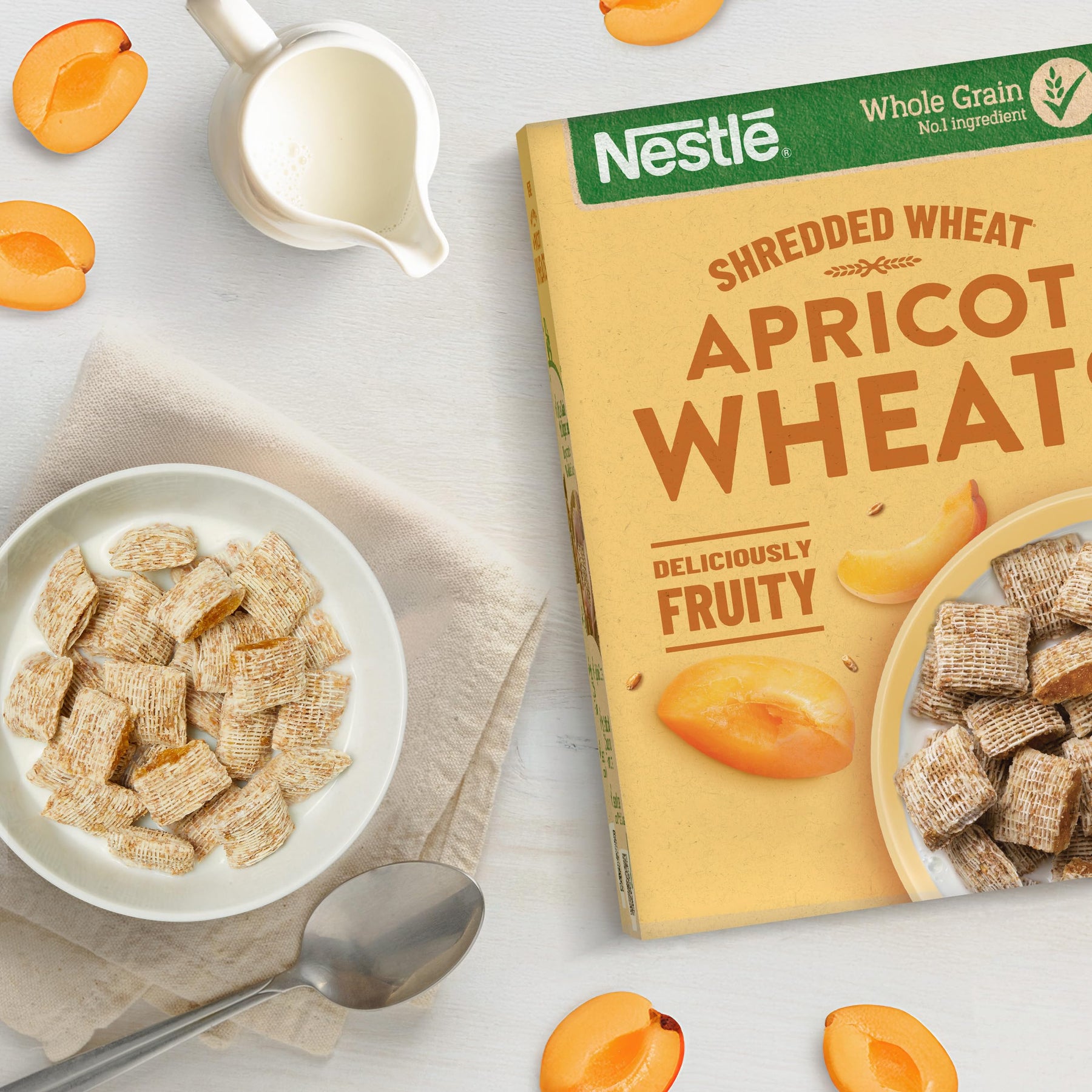 Start your day with the deliciously fruity taste of Shredded Wheat Apricot Wheats. Made from toasted whole grain wheat and filled with a sweet apricot fruit filling, this wholesome cereal offers a satisfying crunch with every bite. With 71% whole grain as the number one ingredient, it's a high-fibre breakfast choice that contains no artificial colours or flavours and is suitable for vegans.