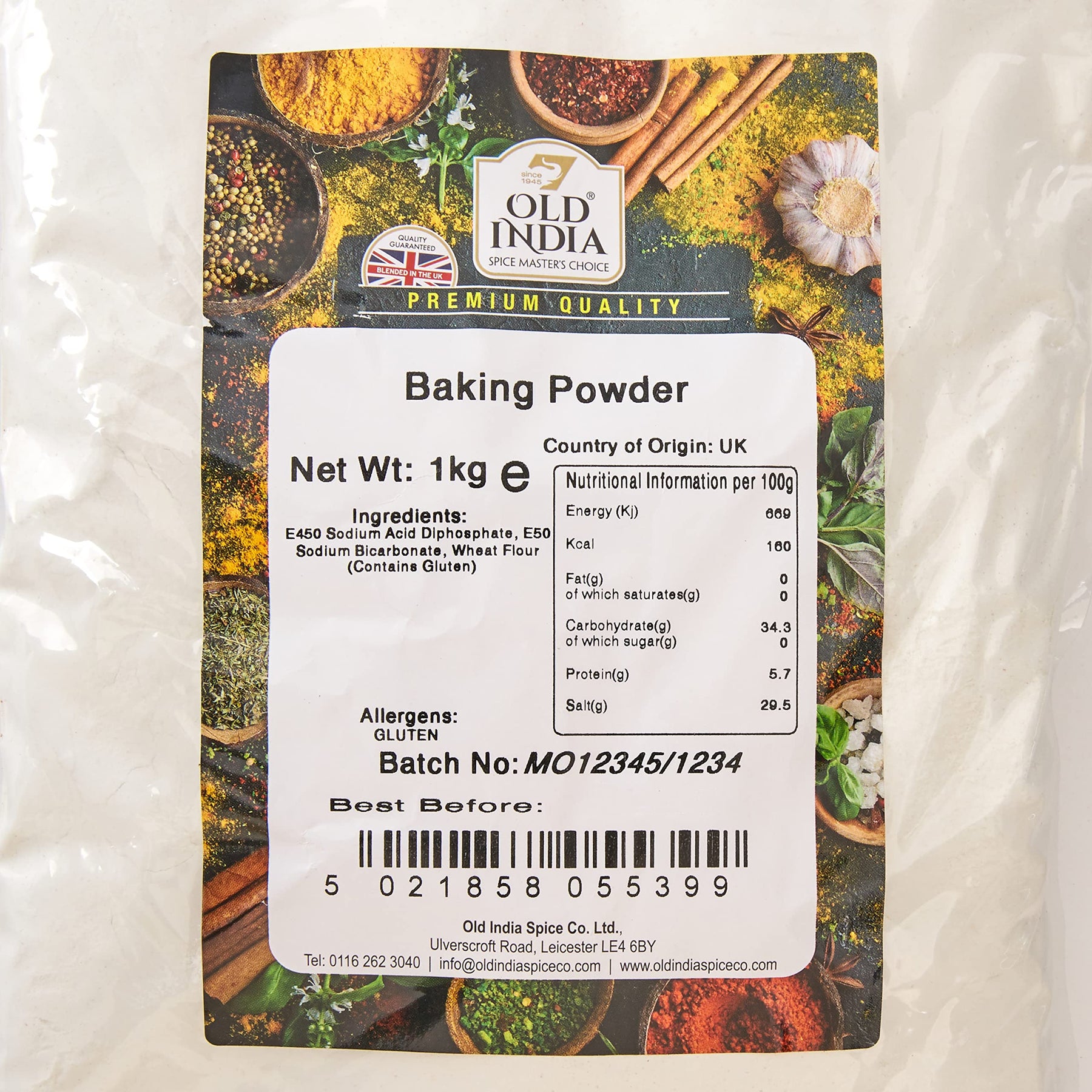Old India Baking Powder is a high-quality raising agent crafted for perfect results in your baking and cooking. This 1kg pack contains a blend of E450 (Sodium Acid Diphosphate), E500 (Sodium Bicarbonate), and WHEAT Flour (Contains GLUTEN), making it ideal for cakes, breads, and a variety of baked goods.