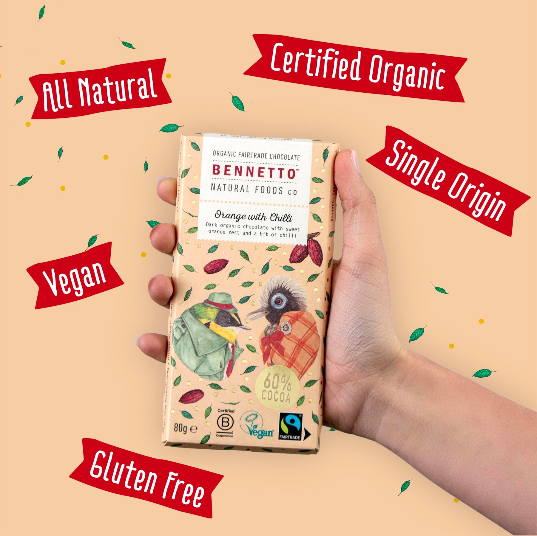 Indulge in the bold fusion of zesty orange and a subtle kick of chilli in this premium dark chocolate bar from Bennetto. Crafted with single-origin cocoa from Ecuador and made using traditional Swiss methods, this vegan and gluten-free chocolate offers a rich, complex flavour profile that delights the senses. The bar features Fairtrade ingredients, including candied orange peel, cocoa mass, cane sugar, cocoa butter, orange oil, and natural chilli flavouring, all encased in beautifully illustrated packaging that reflects the care and artistry behind every bite.