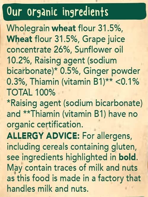 - Organic toddler biscuits made with wholegrain wheat flour, grape juice concentrate, and real ginger