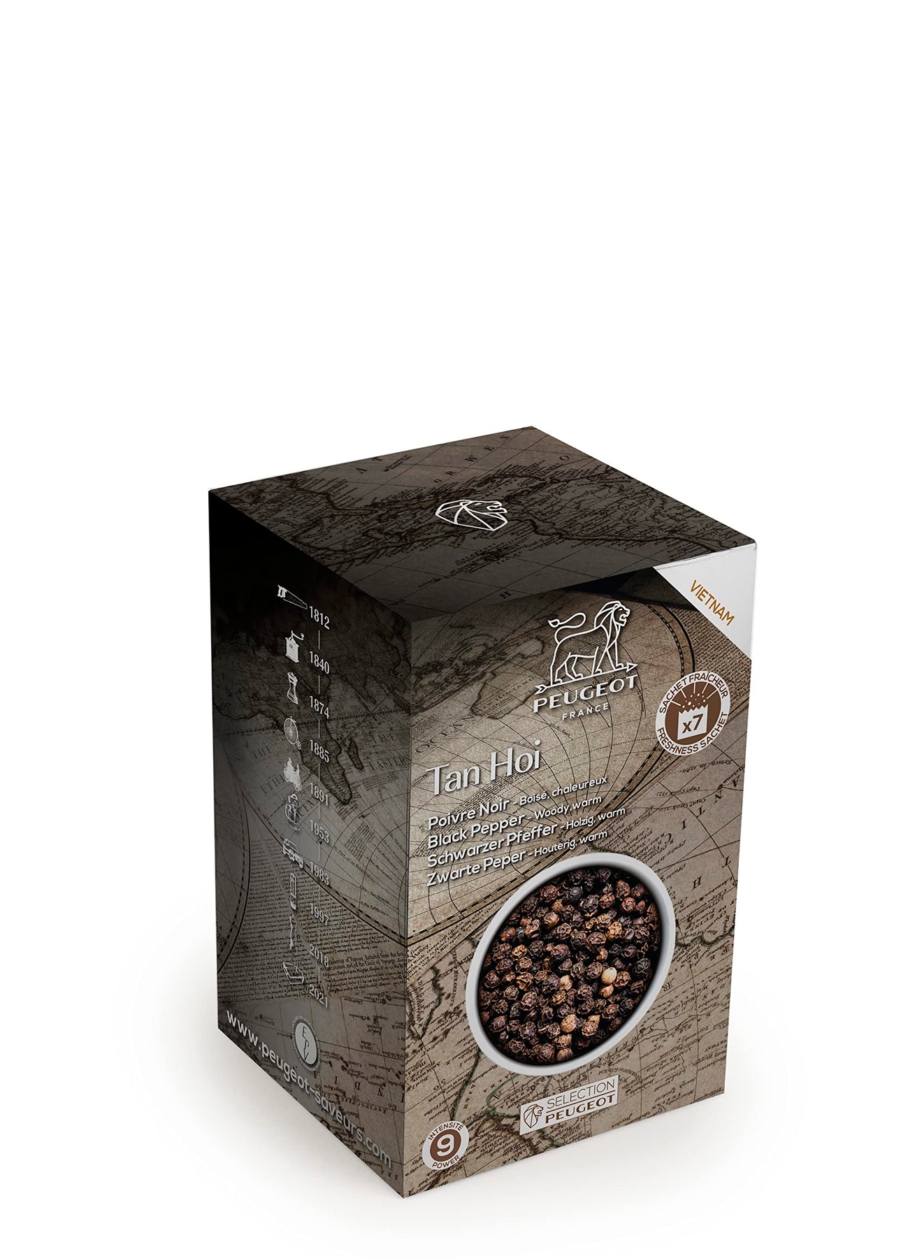 Experience the bold intensity of PEUGEOT's Tan Hoi Black Peppercorns, sourced from Vietnam and rated at intensity level 9. Part of the renowned PEUGEOT Spice Selection range, these premium peppercorns are preserved in multiple airtight sachets to maintain freshness and aromatic quality. Designed for optimal conservation and easy filling, they are ideal for use with the Maestro Pepper Bar (not included), ensuring long-lasting flavor and fragrance.