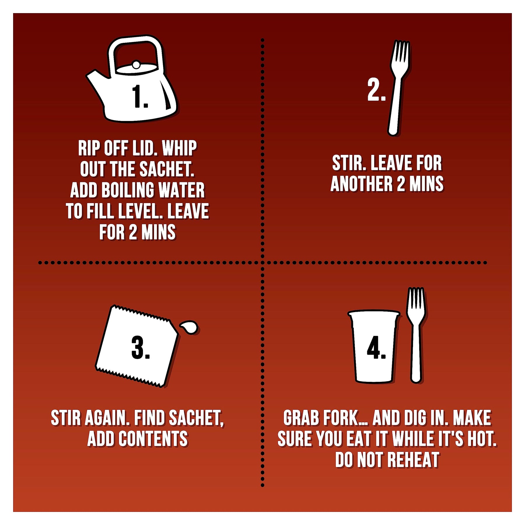 - Preparation: Add boiling water to fill level, cover, wait 2 minutes, stir, wait 2 more minutes, stir again with sachet contents, and enjoy