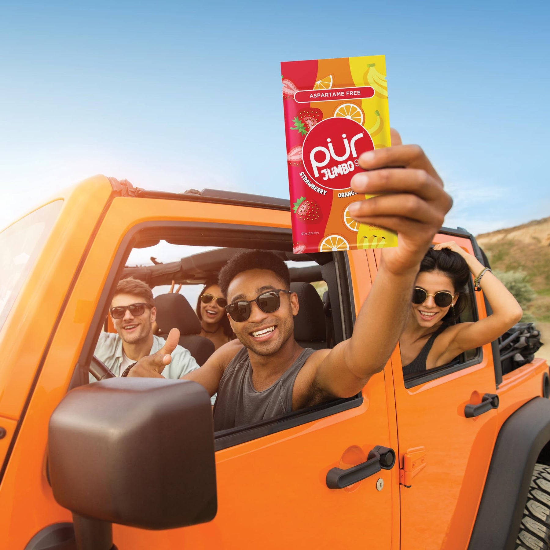Experience a naturally delicious, big fruity flavor with PUR Jumbo Gum. This resealable pack features larger-than-usual gum pieces in mouthwatering natural strawberry, orange, and banana flavors, delivering a satisfying and long-lasting chew that brings back childhood memories—only better.