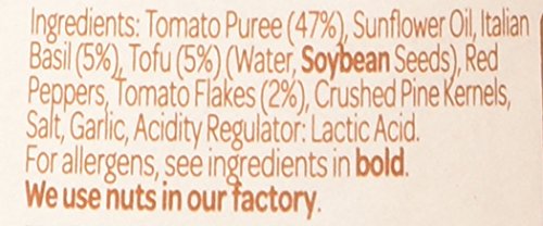 - Ingredients: Tomato Puree (47%), Sunflower Oil, Italian Basil (5%), Tofu (5%) (Water, SOYBEAN Seeds), Red Peppers, Tomato Flakes (2%), Crushed Pine Kernels, Salt, Garlic, Acidity Regulator: Lactic Acid