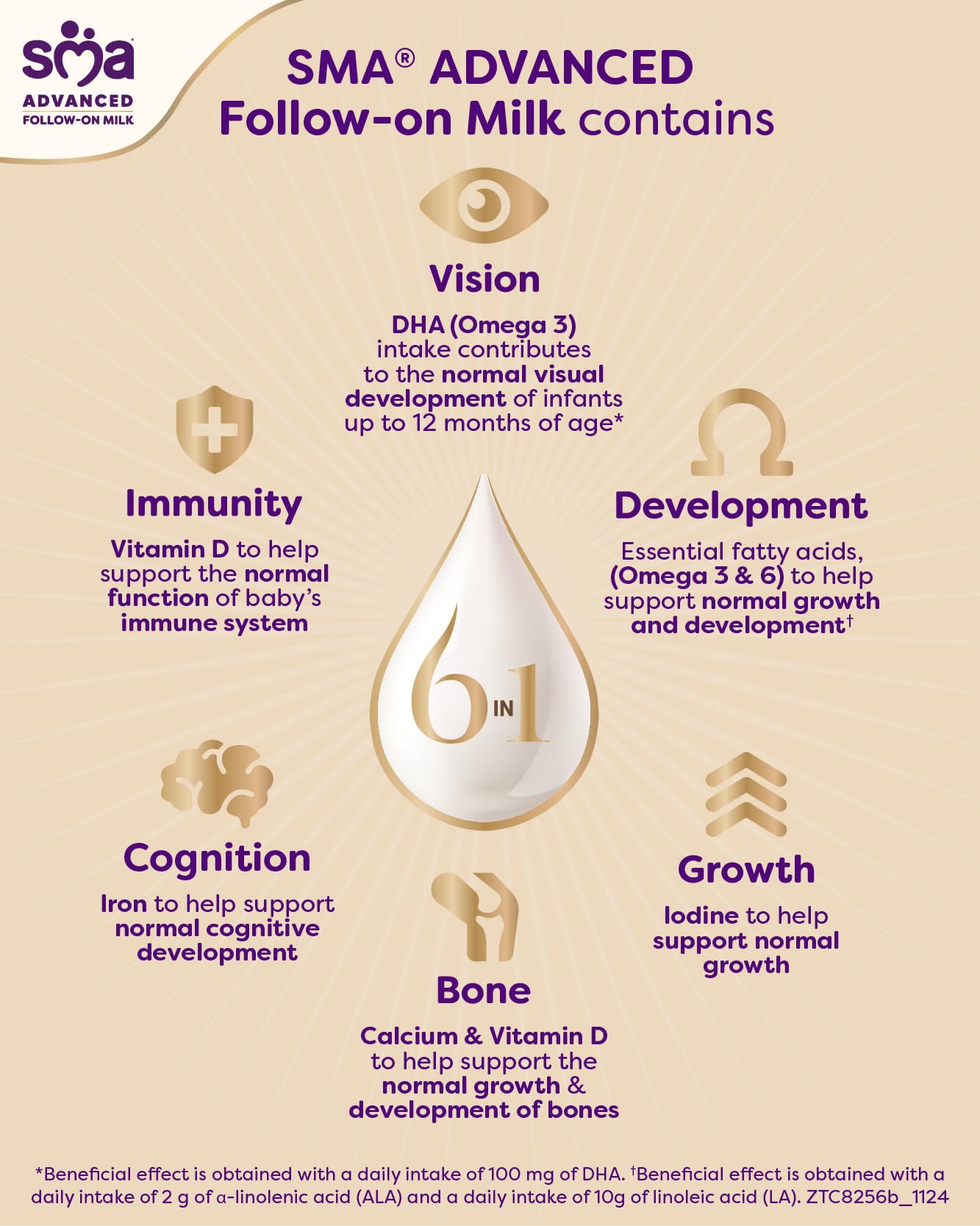 Nourish your baby with SMA ADVANCED Follow-on Milk, a scientifically crafted formula that supports their development during weaning and beyond.