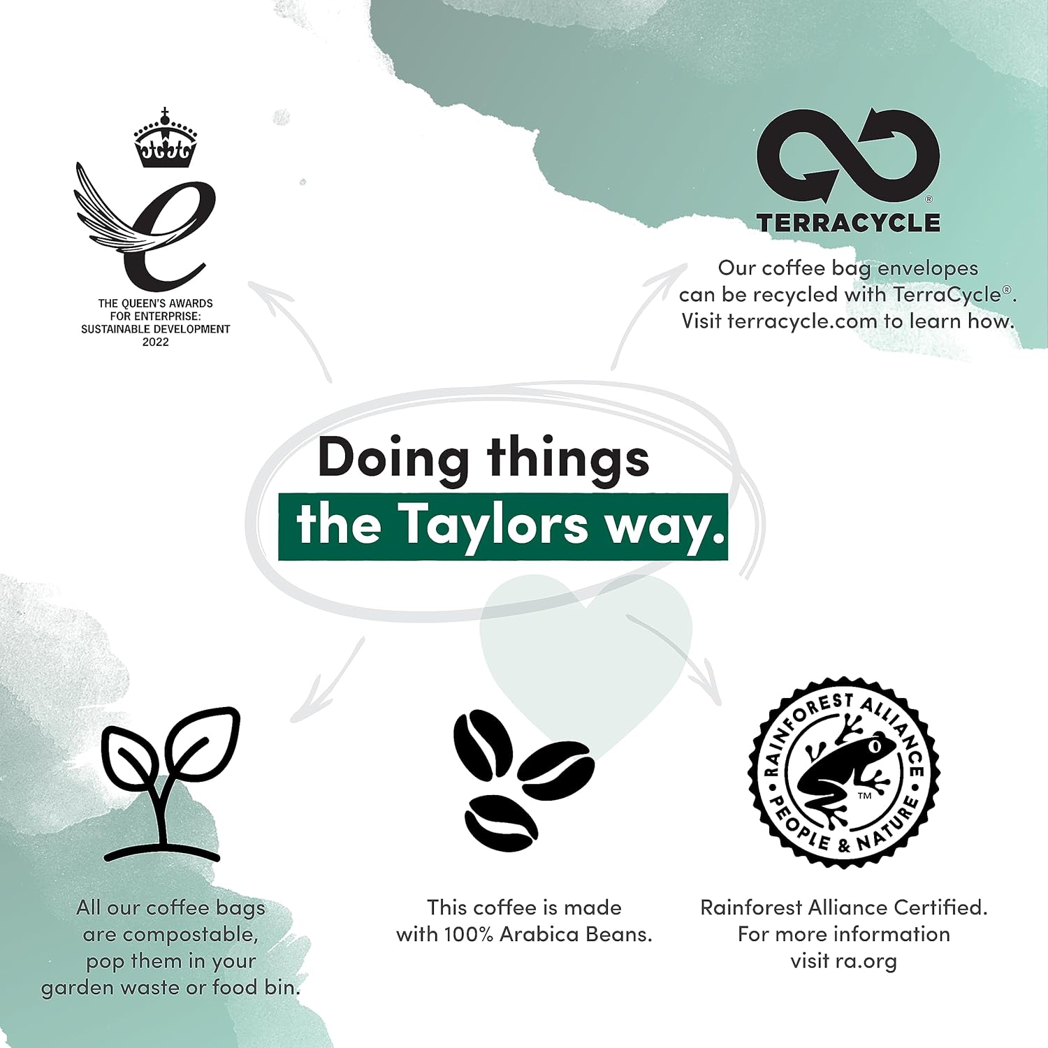 Each coffee bag is individually wrapped for freshness and designed to brew directly in your cup — no mess, no fuss. For environmentally conscious disposal, used envelopes can be recycled through the Taylors TerraCycle scheme.